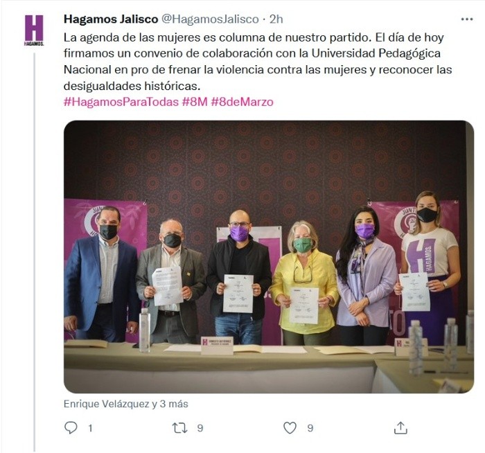 La Coordinación Ejecutiva de Hagamos y la Universidad Pedagógica Nacional firmaron una colaboración que consiste en el lanzamiento del diplomado Desarrollo de Capacidades para impulsar la igualdad sustantiva “Juntas Hagamos”.Valeria Ávila Gutiérrez, vicepresidenta de Hagamos, afirmó que dicha agenda marca la columna vertebral de Hagamos: “lo vemos de una forma transversal, la agenda de las mujeres, es la agenda de la humanidad, estamos tratando de revolucionar las formas en las que venimos construyendo la política desde Hagamos”.“Hoy tenemos la oportunidad de tener este tipo de convenios tan importante para la progresividad de los derechos de las mujeres, en los derechos políticos, para el ejercicio de la ciudadanía y seguir brindando las herramientas de participación que les asegure una vida libre de violencia al interior de las instituciones como lo son los partidos políticos”, manifestó Valeria Ávila.La representante de la Colectiva Juntas Hagamos, Cristina Carrasco Acosta, dijo que en el marco del próximo 8 de marzo, “la agenda de las mujeres es también la agenda que tenemos como defensa en nuestro partido político”.La diputada Mara Robles Villaseñor y el diputado Enrique Velázquez González, de Hagamos, coincidieron en la importancia de este tipo de colaboración para lograr cambiar muchas cosas y sobre todo en aquellas donde las mujeres son relegadas.Miguel Ángel Pérez Reynoso, encargado de la dirección de la Universidad Pedagógica Nacional, destacó que el diplomado con Hagamos generará un compromiso de formar para la equidad, para el respeto, para el reconocimiento de las diversidades, para poner por delante los derechos de las mujeres será el primer componente que vamos a tener entre este instituto político y la Universidad Pedagógica Nacional.Por su parte, la académica de la Universidad, Lourdes Ángulo Salazar, informó que el contenido del diplomado estará dividido en tres módulos: El primero es el avance en el conocimiento en el estudio de genero feminista, el segundo el fenómeno de la violencia hacia las mujeres y el tercero el marco normativo jurídico en el marco internacional, nacional y local.JM