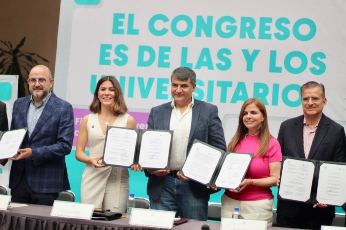 Diputados firmaron un convenio de colaboración entre el Congreso del Estado de Jalisco, la Universidad de Guadalajara (UdeG) y el Centro Universitario de Ciencias Económico Administrativas (CUCEA), con el objetivo de establecer programas de formación continua para los servidores públicos, generar espacios para que las y los alumnos realicen sus prácticas profesionales e intercambiar publicaciones académicas.Al respecto, la diputada y presidenta de la mesa directiva del Congreso de Jalisco, Mónica Paola Magaña Mendoza, quien además fue la promotora de la firma del convenio, habló de los retos que enfrenta el estado en la actualidad. Resaltó que, con la firma de este documento, “se crearán puentes sólidos entre la academia y el Congreso, lo que permitirá fortalecer el trabajo legislativo”.Por su parte, el legislador y presidente de la Junta de Coordinación Política, Miguel de la Rosa Figueroa, destacó que, en la pluralidad, se han encontrado coincidencias, como el hecho de que “a la Universidad de Guadalajara no se le puede escatimar ningún apoyo requerido en las decisiones del Congreso”.Además, el rector de CUCEA, Luis Gustavo Padilla Montes comentó que con dicho convenio se generará un nuevo modelo en el que las y los estudiantes puedan asistir al Poder Legislativo para realizar sus prácticas profesionales y desarrollar investigación temprana.De igual manera, la rectora electa de la UdeG, Karla Planter Pérez y el rector general de esta misma casa de estudios, Ricardo Villanueva Lomelí coincidieron en los beneficios que la firma del convenio traerá para ambas instituciones y puntualizaron que “se profundizará la relación con los representantes de los jaliscienses para el beneficio de todos”.Estuvieron presentes durante la firma los diputados Itzcóatl Tonatiuh Bravo Padilla, Sergio Miguel Castellanos, Valeria Guadalupe Ávila Gutiérrez, Edgar Enrique Velázquez González, José Guadalupe Buenrostro Martínez, Leonardo Almaguer Castañeda, José Luis Tostado Bastidas, César Octavio Madrigal Díaz, Alberto Alfaro García, Miguel de la Rosa Figueroa, Laura Gabriela Cárdenas Giménez, Alejandra Giadans Valenzuela y María del Refugio Camarena Jáuregui, así como Eduardo Fabián Martínez Lomelí, secretario general del Poder Legislativo.Finalmente, por parte de la Universidad de Guadalajara, asistieron Guillermo Gómez Mata, secretario general; Ana Alvarado Peña, jefa de Servicio Social, y Zoé García Romero, presidenta de la FEU.NA