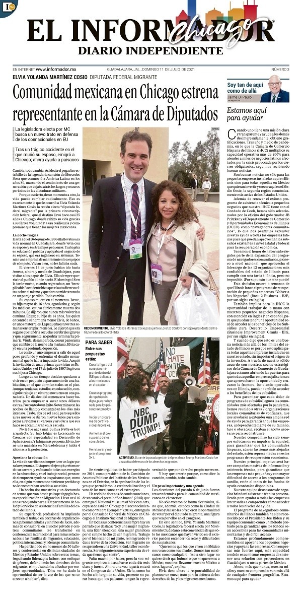 Con el objetivo de llevar a nuestros paisanos un pedacito de México, desde el pasado domingo 4 de julio del 2021 se lanzó la edición especial de EL INFORMADOR Chicago.Cada semana, los lectores podrán encontrar noticias que están pensadas en resaltar los logros y experiencias de los mexicanos en Chicago.Esta semana podrás conocer, entre otros contenidos, la historia de Elvia Yolanda Martínez Cosío, la primera diputada federal migrante por la primera circunscripción (en la que se encuentra Jalisco), quien tras un trágico accidente en el que murió su esposo, emigró a Chicago, donde se ha enfocado en ayudar a los paisanos.Te invitamos a descubrir esta edición especial a través de la aplicación de EL INFORMADOR en donde tendrás acceso a este y otros contenidos exclusivos como nuestros suplementos especiales, Gente Bien y próximamente la edición diaria de los Juegos Olímpicos Tokio 2020.INFORMAPLUS ofrece una experiencia de lectura única, jerarquizada y editada como en nuestra versión impresa, pero con los valores y herramientas de una versión digital hojeable, como leerlo en formato de página o por nota, marcar o compartir tus favoritos, copiar contenidos e incluso, si lo prefieres, escucharlos.Descarga INFORMAPLUS y disfruta de 30 días de prueba gratis. Una vez que te suscribas podrás recibir cuatro tarjetas de CÍRCULO INFORMADOR que podrás repartir entre tus amigos y familiares para que disfruten de los beneficios exclusivos de este programa.Descargala y pruébala sin costoiOS https://apple.co/38sopZ0 Android https://bit.ly/3cjcLRh JM