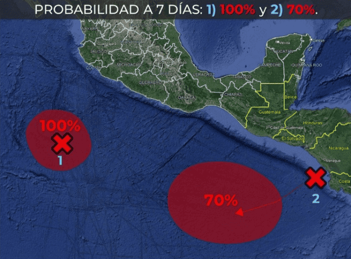 El Servicio Meteorológico Nacional, fuente oficial del Gobierno de México en materia climática, ha vigilado un área en el Océano Pacífico desde hace días que hoy incrementó su posibilidad de desarrollo ciclónico. "Norma" podría aparecer en cualquier momento.El SMN informó que este mediodía de martes la zona de baja presión al suroeste de Michoacán, incrementó a 100% su probabilidad para desarrollo ciclónico a 48 horas y en 7 días, que llevaría el nombre de "Norma".Zonas de vigilancia del SMN:Además, el SMN informó que se esperan lluvias de fuertes a intensas en el occidente, sur y sureste de México para este martes.También se actualiza:* * * Mantente al día con las noticias, únete a nuestro canal de Whatsapp * * *Con información Servicio Meteorológico NacionalOA