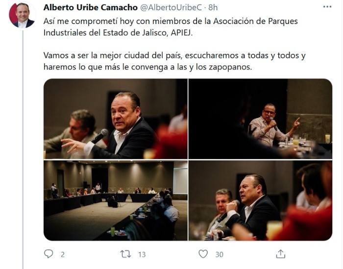 El candidato a la alcaldía de Zapopan por Morena, Alberto Uribe, lamentó este jueves que sólo el 20% de la población de la ex villa maicera concentre el 80% de la riqueza del municipio, lo cual dijo, representa la desigualdad.Por ello, aseguró, debe trabajarse para modificar el modelo económico a fin de garantizar mayores oportunidades para las personas más vulnerables, a través de la generación de empleos y la atracción de inversión al municipio. Con ello, añadió, las empresas también se verán beneficiadas.Lo anterior fue expresado durante la reunión que sostuvo este jueves con empresarios de la Asociación de Parques Industriales de Jalisco (APIEJ), donde además de presentar sus propuestas de gobierno, los invitó a sumarse a su proyecto político a través del voto el próximo 06 de junio.El candidato prometió que de llegar al cargo tras la elecciones “aplicará toda su experiencia y contactos adquiridos en la Secretaría de Relaciones Exteriores con embajadas y consulados del mundo para tocar puertas y aumentar la inversión extranjera”.“Todos sus parques que tienen acá, cualquier espacio que tengan libre, yo me encargo de mandar al extranjero para decirles a nuestras diferentes embajadas que aquí hay un espacio, aquí hay una oportunidad, tenemos que hacer más parques (industriales), que Zapopan se convierta en la cabeza de este país y del continente en Latinoamérica en la atracción extranjera” expresó el candidato.Uribe Camacho también aseguró que llevará a Zapopan “a ser la mejor Ciudad de México” y que su competencia no se medirá con Guadalajara, sino con otras ciudades del mundo que sean referentes internacionales.JM