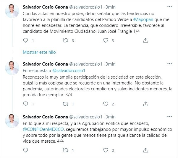 El candidato a la presidencia municipal de Zapopan, Salvador Cosío Gaona, reconoció la noche de este domingo que las tendencias preliminares no favorecieron a la planilla de candidatos del Partido Verde a Zapopan, por lo que consideró "irreversible" la tendencia a favor que conserva el candidato de Movimiento Ciudadano, Juan José Frangie.A través de un comunicado, Cosío Gaona aseveró que le exigirá a Frangie trabajar en pro de la seguridad que la población reclama, considerar como prioritaria la agenda verde y trabajar con firmeza para atender las necesidades del municipio.Cosío aseguró que, en lo que a él respecta, seguirá trabajando para darle a Zapopan un mayor impulso económico y ayudar a las personas que menos tienen.Por otro lado, el candidato del Partido Verde reconoció y celebró la amplia participación de la ciudadanía en estas elecciones, las cuales calificó de "ejemplares".JM
