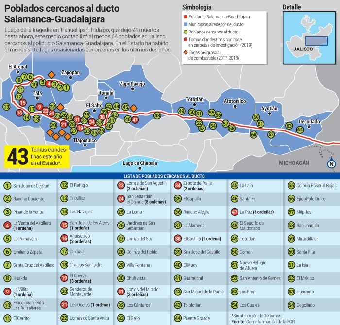 En Jalisco existen al menos 64 poblaciones ubicadas en las cercanías del ducto de Petróleos Mexicanos (Pemex) Salamanca-Guadalajara, y en muchas de esas zonas se han descubierto tomas clandestinas, o incluso registrado fugas de combustible, de acuerdo con una revisión del mapa por donde cruza el ducto en 11 municipios de la Entidad.Entre esos municipios, el que más concentra poblaciones aledañas al ducto es Tlajomulco de Zúñiga, pues suma 18, casi la tercera parte de todos los pueblos enlistados.Los municipios en Jalisco por donde cruza el poliducto desde la frontera con Michoacán son: Degollado, Ayotlán, Atotonilco, Tototlán, Zapotlanejo, Tonalá, El Salto, Tlajomulco, Tala, El Arenal y Zapopan.Tala, ubicado a 50 minutos de la ciudad, es el segundo municipio con más poblaciones cercanas: suma 10 de ellas. De hecho, históricamente las localidades con más hallazgos de tomas clandestinas en Jalisco están cerca de la capital: Tlajomulco, Zapotlanejo y Tala. Ayer, el Presidente Andrés Manuel López Obrador anunció una estrategia de apoyos para los 91 municipios en todo el país por donde pasan poliductos de Pemex.Entre los apoyos a esos sitios destaca el programa de pensiones y becas, pero además a productores del campo y créditos a comerciantes. Su plan “inyectará” tres mil 857 millones de pesos a esos puntos.La tragedia del pasado 18 de enero en Tlahuelilpan, Hidalgo, donde un ducto se incendió mientras había gente recolectando gasolina de una fuga (hecho que suma 98 decesos) originó ese programa.“Vamos a enfrentar así la práctica lamentable de recoger gasolina de zanjas, fugas o de tomas clandestinas para que no haya desgracias. Que la gente, cuando haya una fuga, una toma clandestina, no se acerque. Esto (el saqueo de ductos) se fue dando porque se abandonó a la gente”.En Jalisco, desde 2017 se han reportado ocho fugas de combustible. La primera, el 14 de febrero de ese año sobre la carretera a Nogales, a la altura del fraccionamiento Pinar de la Venta, en Zapopan. En esa ocasión, el ducto se incendió por una toma clandestina que consumió alrededor de 900 mil litros de gasolina.Pero Tlajomulco es el municipio con más fugas de combustible registradas cerca de poblaciones en ese periodo. Una de las más relevantes ocurrió la noche del 12 de abril de 2017, junto al fraccionamiento Los Encinos. Cerca de tres mil personas fueron evacuadas por el riesgo de explosividad.Días atrás, el 30 de marzo, ocurrió otra fuga con incendio en la población de El Zapote del Valle, misma que dejó una persona fallecida.El pasado 7 de enero, autoridades federales informaron el hallazgo de 14 tomas clandestinas por parte de elementos de Seguridad Física de Petróleos Mexicanos (Pemex) durante sus recorridos de vigilancia. Tan sólo cinco de ellas se encontraron en las cercanías de La Paz, en Zapotlanejo.Las poblaciones de San Sebastián el Grande, en Tlajomulco de Zúñiga, y La Paz (Piedras Negras), en Zapotlanejo, son las comunidades donde más tomas clandestinas se han descubierto en lo que va del año, con ocho en cada una, de acuerdo a información de la Procuraduría General de la República.A la fecha se ha notificado del hallazgo de 43 tomas clandestinas en diferentes municipios, de las que al menos 19 de ellas —prácticamente la mitad— fueron localizadas en Tlajomulco de Zúñiga.Esto, pese a que se trata de la demarcación con más presencia de asentamientos humanos de los 11 municipios de Jalisco por donde cruza el poliducto Salamanca-Guadalajara.En Zapotlanejo, al menos durante este año, los huachicoleros han concentrado sus robos en las cercanías a la población de La Paz, pues es la que sigue en hallazgos con las ocho tomas señaladas. Tala es el tercer municipio que ha sumado hallazgos con cuatro tomas: en San Juan de Los Arcos, La Villita y dos en Ahuisculco. En Zapopan encontraron una en La Venta del Astillero y otra más en El Salto, cuya ubicación no se precisó.El pasado 27 de diciembre, el Presidente Andrés Manuel López Obrador anunció un programa con el que se buscaba reducir el huachicoleo o robo de hidrocarburo desde dentro y fuera de Pemex.De acuerdo con datos de la Comisión Nacional de Seguridad, el 4 de diciembre de 2018 se desviaron al mercado ilícito 126 mil barriles de combustible, cantidad que variaba.Sin embargo, tras intervenir el Centro de Control de Pemex en la Ciudad de México el 21 de diciembre, el desvío de hidrocarburo comenzó a bajar hasta solo cinco mil barriles el 31 de diciembre, previo al arranque del desabasto de gasolinas en distintas entidades.Ese día fue la cantidad de desvío más baja, puesto que tras la apertura de los ductos para tratar de normalizar el abastecimiento, los robos aún promedian los 20 mil barriles diarios (unos tres millones de litros al día).El 20 de enero, incluso, el desvío de hidrocarburo fue de 38 mil barriles, de acuerdo a datos de la Comisión Nacional de Seguridad.La Asociación Mexicana de Empresarios Gasolineros (Amegas) confirmó la llegada de 60 mil barriles de diésel y gasolinas Magna y Premium a instalaciones de Pemex, en El Salto, por lo que “se espera que mañana miércoles (hoy) y jueves se refleje en la cobertura de las 500 estaciones de servicio” en la metrópoli. En un comunicado, detalló que el poliducto Salamanca-Guadalajara cerró operaciones ayer a las 14:00 horas, pero espera reanudar hoy a las 06:00.Al menos 300 estudiantes del Colegio de Bachilleres del municipio de Cuautepec, en el Estado de Hidalgo, fueron desalojados luego de que se registrará otra fuga de combustible. La perforación se ubicó a 400 metros del plantel. Al percatarse del fuerte olor a combustible, el director de ese instituto pidió a los estudiantes que se fueran a su domicilio. La toma pudo ser controlada por personal de Petróleos Mexicanos (Pemex), aunque también militares y policías federales llegaron al sitio.Después de que el 14 de enero, los titulares de Hacienda, Carl