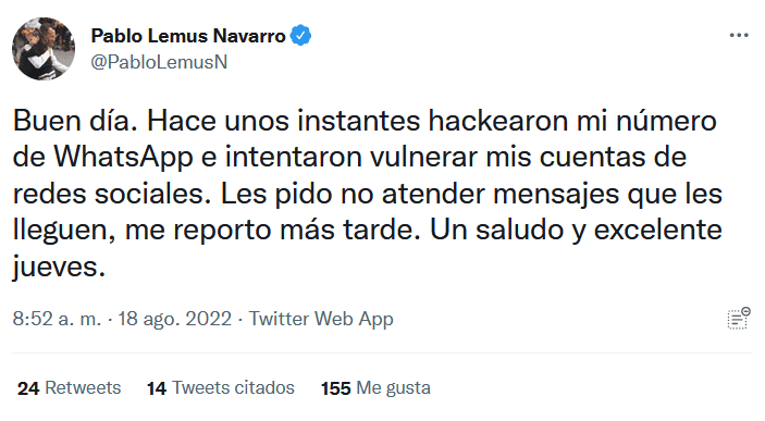 Ni las autoridades se salvan. A través de sus redes sociales, tanto el gobernador de Jalisco como el alcalde de Guadalajara, Pablo Lemus Navarro, denunciaron el mal uso que terceras personas le dieron a sus números personales.El mandatario estatal señaló que “hace tiempo” cambió su número celular debido a que recibió información de que había sido hackeado o intervenido y que estaba siendo usado para hacer fraudes.“Si te llega un mensaje del número con terminación 1618, diciendo que soy yo y que están pidiendo dinero, es una estafa. No caigas y denuncia. Yo jamás enviaría ese tipo de mensajes”, señaló el gobernador.Por su parte, el alcalde de Guadalajara, Pablo Lemus Navarro, indicó que este mismo jueves su número telefónico había sido intervenido, y además, quienes se encargaron de ello intentaron también vulnerar sus cuentas de redes sociales.“Les pido no atender mensajes que les lleguen, me reporto más tarde. Un saludo y excelente jueves”, añadió el munícipe en su publicación.Esta no es la primera vez que ocurre una situación similar. En octubre del año pasado, cuatro gobernadores fueron hackeados en solo una semana: la gobernadora de Guerrero, Evelyn Salgado; el de Chiapas, Rutilio Escandón; el de Tampico, Francisco Cabeza de Vaca y el gobernador de Morelos, Cuauhtémoc Blanco.En todos los casos los gobernantes anunciaron la intervención de sus números a través de sus redes sociales, y le pidieron a la ciudadanía y a sus allegados hacer caso omiso de los mensajes que pudieran llegar a recibir, pues en al menos tres de los hackeos se había intentado extorsionar a terceras personas por medio de los números ya intervenidos.GC