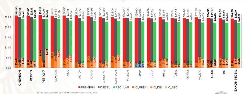 Cada día el precio de la gasolina tiene un aumento, por lo que es importante mantenerse informado para saber en dónde la venden más económico, ya que para los automovilistas y los motociclistas, el gasto de este consumo tiene un impacto significativo en sus bolsillos.De acuerdo con la Profeco, el precio promedio diario de la gasolina regular, premium y diésel oscilan entre los 22 y los 24 pesos por litro. De acuerdo con la investigación que hizo la Procuraduría Federal del Consumidor, la marca que la vende más económico es EXXON MOBIL por $22.19 pesos por litro en gasolina regular.Del 31 al 6 de agosto del 2023, la Profeco ha revelado cuáles son las marcas que venden la gasolina regular y premium más económica y más cara. En Jalisco, la gasolina regular en la gasolinera AKRON ubicada en Zapopan, en Avenida Patria 574 está a $23.99 en precio al público promedio está catalogada con los precios más altos. De acuerdo con el reporte, el precio de ganancia que tiene la empresa es del $1.22 pesos.Por su parte, en la Calzada Independencia 3869 en la gasolinera AKRON, la gasolina PREMIUM está a $25.99 pesos el litro en venta al público promedio.De acuerdo con la Profeco, los precios más bajos de la gasolina regular están fuera de la región Occidente. El precio más económico se encontró en Umán, Yucatán, a $21.59 pesos por litro.