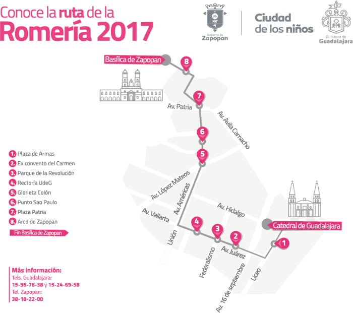 Con motivo de las obras de la Línea 3 del Tren Ligero, por tercer año consecutivo la Romería 2017 se realizará por la ruta alterna de Américas.Se espera que los feligreses inicien el recorrido este jueves 12 de octubre en la Catedral de Guadalajara alrededor de las 06:30 horas y culminará en la Plaza de las Américas Juan Pablo II.El recorrido estará dividido en cinco bloques que son: Centro Histórico de Guadalajara; avenida Vallarta; avenida Américas- avenida México- calle Buenos Aires; avenida Américas-avenida Patria y Centro histórico de Zapopan.En específico, la ruta este año iniciará en Plaza de Armas, después continuará por avenida Juárez, desde calle Liceo y seguirá hasta llegar a avenida Américas. De ese punto, los fieles seguirán por Punto Sao Paulo, Plaza Patria, Arcos de Zapopan, hasta llegar a la Basílica de Zapopan, donde se espera iniciar la ceremonia religiosa a las 11:30 horas.Cierres vialesLa Secretaría de Movilidad anunció que los cierres viales comenzarán mañana miércoles a las 16:00 horas en avenida Hidalgo, en su cruce con avenida Alcalde, así como en la calle Pino Suárez en su cruce con calle Independencia, debido a la misa que se celebrará en la explanada del Instituto Cultural Cabañas.Ese mismo día, avenida Patria será restringida a la circulación en ambos de sus sentidos entre las avenidas Enrique Díaz de León y Acueducto.Aclaran que las únicas rutas para cruzar todo el trayecto de la Romería serán los carriles centrales de avenida López Mateos-Circunvalación, Periférico Poniente y la Calzada Independencia.En este operativo vial participará un estado de fuerza que involucra a 450 policías viales, 50 motopatrullas, 105 autopatrullas y 10 cicloviales por turno.RecomendacionesDesayunar para evitar complicaciones durante el recorrido.Adultos mayores y niños porten un gafete con información básica.Llevar zapatos cómodos.Hidratarte (evita los envases de vidrio).Ubica los módulos de recorrido ante cualquier emergencia.Visita la página romeria.mx para mayor información