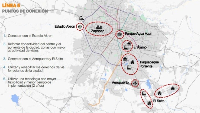 El Sistema de Tren Eléctrico Urbano (SITEUR) de Guadalajara cuenta, actualmente, con tres líneas. La primera, la más vieja, conecta ambos periféricos, sur y norte, atravesando Colón y Federalismo. La Línea 2, inaugurada en 1994, va de oriente a poniente, recorriendo el otro lado de la Calzada Independencia, desde Juárez hasta Javier Mina.La línea 3, inaugurada en septiembre del 2020, va desde Tlaquepaque hasta Zapopan, desde la Nueva Central Camionera, pasando por el Centro Histórico de Guadalajara, hasta Arcos Zapopan, y se prevé que se amplíe hasta Tesistán. Por su parte, se contempla también que en algún momento la L1 sea extendida hasta Santa Anita, para así agilizar el tráfico diario del sur de la ciudad, en concreto en la zona de López Mateos. La línea 4 del Tren Ligero, que está en construcción y que lleva un avance actual del 53%, conectará a Tlajomulco, desde la cabecera municipal, hasta Periférico Sur, lo que dará movilidad a una zona complicada en cuanto a transporte para los residentes de la zona. Se tiene previsto que la L4 del Tren Ligero arranque hasta el primer semestre del 2025. El gobernador electo, Pablo Lemus, desde las campañas electorales, dio a conocer su intención de inaugurar otra línea más del Tren Ligero, la L5, y que sería uno de los proyectos más ambiciosos de su gobierno, pues tiene previsto concluirla para el 2026, que es cuando Guadalajara será sede de algunos partidos en la Copa Mundial de Fútbol del 2026.Si bien la L5 ha sido un proyecto que ha generado debates desde su concepción -pues no será un tren como tal, sino que se contempla que use un modelo de autobuses eléctricos Digital Rail Transit (DRT)-, además por los tiempos en los que se planea concluirla -en menos de dos años- el recorrido de la L5 sería mucho mayor al de las líneas ya existentes, pues conectaría a la zona conurbada de Guadalajara, con puntos en los que desde hace años se pide que haya transporte público. La L5 conectaría los municipios de El Salto, Tlajomulco, Tlaquepaque, Zapopan y Guadalajara, iría desde el Aeropuerto hasta el Estadio Akron, haciendo uso de los derechos de vía existentes del ferrocarril, lo que implica que no requerirá de viaductos elevados o túneles, sino que utilizará las vías que ya existen y atraviesan secciones importantes de la ciudad. La L5 tendría un costo aproximado de 14 mil 780 millones de pesos, con inversión federal, estatal, y privada. Se tiene contemplado que quede concluida antes de la Copa Mundial del Futbol, la cual ocurrirá en junio del 2026. FS