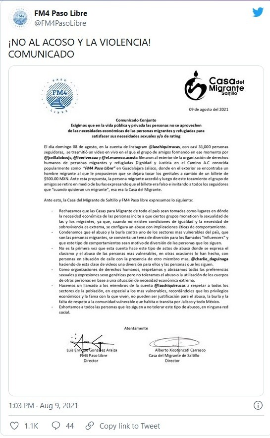 La organización FM4, en conjunto con la Casa Migrante Saltillo, denunciaron y reprobaron los abusos que cometieron tres presuntos “influencers” locales contra una persona migrante en las inmediaciones de la organización FM4, ubicada en la colonia Arcos Vallarta, en Guadalajara.A través de un comunicado, las organizaciones rechazaron las acciones cometidas el pasado domingo 08 de agosto, cuando a través de la cuenta de Instagram @laschiquirrucas, con casi 31 mil seguidores, se transmitió un video en vivo en el cual un grupo de personas identificadas como @jcvillalobos, @feeriveraaa y @el.muneco.acosta, cometieron actos de abuso contra un hombre migrante.En el video se observa que las personas señaladas ofrecieron un billete de 500 pesos al hombre para que se dejara tocar los genitales, ante lo cual accedió, y luego de este tocamiento el grupo se sujetos se retiró en medio de burlas, asegurando que el billete era falso.Además de ello, durante la transmisión refirieron a sus seguidores que, “cuando quisieran un migrante esa era la Casa del Migrante”, motivándolos a llevar a cabo este tipo de abusos.Ante tal situación, tanto la Casa Migrante Saltillo como el organismo defensor mostraron su rechazo a que las casas migrantes del país sean tomadas como lugares en donde la necesidad económica de las personas incite a que ciertos grupos moneticen la sexualidad de las y los migrantes.Lo anterior, refirieron, debido a que “cuando no existen condiciones de igualdad y la necesidad de sobrevivencia es extrema, se configura un abuso con implicaciones éticas de comportamiento”.También condenaron el abuso y la burla contra este sector de personas, el cual, refirieron, es uno de los más vulnerables del país, llevando a que se convierta en un tema de diversión para este sector de personas denominadas como “influencers” y para quienes los siguen en sus redes sociales.Además, dijeron, no es la primera vez que esta cuenta hace este tipo de actos de abuso “donde se expresa el clasismo y el abuso de las personas más vulnerables”, en otras ocasiones lo han hecho con personas en situación de calle, acompañados de otro miembro más conocido como @charlie_daguinaga.“Como organizaciones de derechos humanos, respetamos y abrazamos todas las preferencias sexuales y expresiones sexogenéricas, pero no toleramos el abuso o la utilización de los cuerpos de otras personas en base a una situación de necesidad económica extrema”, añadió el comunicado.Por ello, ambas casas migrantes hicieron un llamado a los miembros de @laschiquirrucas a respetar a todos los sectores de la población, recordándoles que “los privilegios económicos y la fama con la que viven no pueden ser justificación para el abuso, la burla y la falta de respeto a la comunidad vulnerable que habita o transita por Jalisco y todo México”.Si te interesó esta noticia y quieres saber más, entonces descarga y descubre INFORMAPlus, la aplicación digital de EL INFORMADOR, en donde tenemos contenidos exclusivos, seleccionados por nuestros editores, para darles una experiencia más completa a los lectores. Si eres suscriptor de EL INFORMADOR tu acceso está incluido, solicítalo al 33 3678-7777Descarga la aplicación y pruébala GRATIS por treinta días.Para iOS: https://apple.co/35jaVgbPara Android: https://bit.ly/3gwVSEVJM
