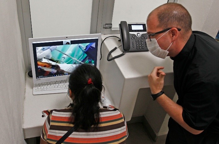 Karla tiene internada desde hace 11 días a su mamá doña Josefina en el hospital Geriátrico del Hospital General de Occidente (HGO) que se reconvirtió en espacio COVID-19.Tiene 81 años, asma y hace dos sábados comenzó a sentirse mal. Le faltaba el aire. La llevaron a la Cruz Verde y luego la trasladaron al HGO.Karla no sabe cómo se enfermó, pero ahora está internada, estable pero grave, y solo la ha podido ver y hablar con ella dos veces por el sistema de videollamadas que instalaron en el lugar.“Ha sido muy difícil porque nunca la hemos dejado sola, siempre que se pone malita hemos estado con ella y ahorita no sabemos qué hacer porque no podemos estar con ella ni verla (físicamente)”, compartió.Y, aunque su mamá no puede hablar mucho, durante el tiempo que tanto Karla como otros de sus familiares la han visto -virtualmente- señalan que ha mejorado. En total son ocho hijos y más de 20 nietos quienes la esperan afuera.“Las videollamadas nos ayudan a por lo menos decirle “échale ganas”, “estamos contigo” porque de otra forma no podemos hacer nada, así podemos ver si va mejorando”, indicó.Con estas videollamadas los 33 pacientes que se encuentran hospitalizados en el lugar pueden conectarse con su familia, a quienes se citan en grupos de seis personas diarias.Mientras, junto con el paciente se encuentra un sacerdote capacitado o personal del hospital que ayuda a establecer la conexión.Uno de ellos es el Padre José Luis González, quien, tal como los doctores, también se tiene que vestir con traje y equipo especial.“Tenemos tres funciones principales: ofrecer los sacramentos para gente internada, dirección espiritual y establecer los enlaces en las videollamadas. Aunque también platicamos con los familiares y con el personal de salud”, resaltó.El 23 de marzo llegó el primer paciente de COVID-19 y también a hospitalización. Pero desde hace un mes, y ante la necesidad de que los familiares puedan verlos y la manera en que están siendo atendidos, se instaló el equipo en una caseta privada.Los familiares que quieren verlos se dirigen a trabajo social y Lorena Cruz, encargada, los agenda.“Detectamos resentimientos de los familiares porque no pueden verlos, de angustia y desesperación, por lo que decidimos poner esta cabina”, informó.LS