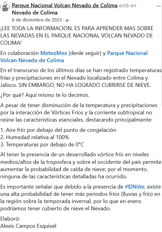 El frente frío número 15, que se reforzará por una masa de aire polar, ocasionará descenso de temperatura en el norte y noreste de México, además de lluvias en algunas regiones, esto, de acuerdo con el más reciente comunicado del Servicio Meteorológico Nacional (SMN). Para la zona del Pacífico centro, donde se encuentra Jalisco, se estima cielo con nubosidad dispersa a lo largo del día, ambiente frío con bancos de niebla en zonas serranas, muy frío con heladas en dichas regiones, aunque un ambiente más cálido en horas de la tarde.Hoy 18 de diciembre de 2024, Jalisco amaneció con temperaturas frescas a frías en gran parte de su territorio, y ante dichas condiciones del clima, las personas pueden caer en preguntas como qué debe pasar para que caiga nieve en el Nevado de Colima, uno de los sitios emblemáticos de la temporada navideña, ya que ofrece la posibilidad de que los habitantes del estado puedan ver paisajes nevados. Antes del inicio del invierno en el hemisferio norte, las temperaturas han descendido en Jalisco, lo cual es normal, sin embargo, no ha nevado en el coloso ubicado al sur de Jalisco. En una publicación en Facebook que data del año pasado, la cuenta Parque Nacional Volcán Nevado de Colima, en colaboración con Meteored, dio a conocer la razón.El texto indica que aunque se han presentado temperaturas bajas, debe haber otras condiciones. El año pasado, por ejemplo, se presentaron lluvias por estas fechas, sin embargo, tampoco reunían las características para que nevara en el momento de la publicación que fue el día 6 de diciembre. Estas son aire frío por debajo del punto de congelación, humedad relativa al 100%, temperaturas por debajo de los 0 grados Celsius.El parque explicó en su post que cuando está presente un vórtice frío en niveles medios/altos de la troposfera y sobre el occidente del país, donde está el volcán, aumentan las probabilidades una nevada. Nada de eso había ocurrido en esta fecha el año pasado y este 2024 tampoco ha ocurrido.Indica la publicación que ante la presencia del fenómeno "El Niño" en 2023 fueron altas las posibilidades de que hubiera periodos de frío y lluvia en el Nevado de Colima. Finalmente sí ocurrieron nevadas días después. En un reporte del pasado 12 de diciembre, la Organización Meteorológica Mundial (OMM) indicó que los pronósticos más recientes de los Centros Mundiales de Producción de Predicciones a Largo Plazo, cifran en un 55% la probabilidad de que, durante los meses de diciembre de 2024 a febrero de 2025, las actuales condiciones neutras (en las que no hay fenómeno "El Niño" ni de "La Niña") evolucionen hasta dar lugar a un episodio de "La Niña", probablemente débil. Este un fenómeno que enfría las aguas superficiales de las partes central y oriental del Pacífico ecuatorial.Hace algunos días, en el marco de que el actual mes de diciembre ha sido percibido como más caluroso entre los jaliscienses, meteorólogos del Instituto de Meteorología y Astronomía (IAM) de la UdeG señalaron que esto es correcto, y en rueda de prensa, los especialistas indicaron que se espera un fin de año con temperaturas de 1 grado más sobre promedio.Indicaron que la percepción de temperaturas más cálidas es correcta, y explicó que parte de esto es resultado del fenómeno de "La Niña", que está por desarrollarse, lo que provoca cielos despejados y poca nubosidad, y que permite la entrada de radiación solar y eleva las temperaturas.*Mantente al día con las noticias, únete a nuestro canal de WhatsAppOF