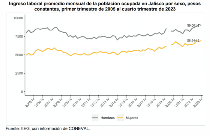 La desigualdad económica entre mujeres y hombres se ha reducido con en el tiempo en Jalisco, pero no es suficiente y falta mucho por hacer para reducir las brechas salariales entre hombres y mujeres reconoció el Instituto de Información Estadística y Geográfica de Jalisco (IIEG).De acuerdo con el IIEG el ingreso laboral promedio mensual de la población ocupada en Jalisco en el cuarto trimestre de 2023 fue de 9,001.32 pesos en los hombres. En el caso de las mujeres, el ingreso laboral promedio mensual fue de 6,944.53 pesos, es decir hay una diferencia de 2 mil 057 pesos menos respecto a los hombres equivalente a casi el 23 por ciento de acuerdo a la ficha de pobreza laboral realizada por el IIEG con datos del Coneval.Mireya Pasillas, directora de la Unidad de Información Estadística y Económica Financiera del IIEG, explicó que en el índice de desigualdad económica de género si se compara desde que se empezó a medir en el 2023 no ha cambiado mucho.“Es muy marginal la disminución de la desigualdad económica de género, falta mucho por hacer, estas desigualdades evitables se pueden disminuir con políticas públicas”, comentó.Añadió que si bien el salario tanto de hombres como mujeres ha aumentado en el tiempo, la brecha salarial se ha mantenido.“La brecha no se ha cerrado, aunque los salarios se siguen aumentando esa brecha no se logra cerrar, lo que está sucediendo es que el mercado laboral deja a las mujeres en desventaja”, añadióAdemás del ingreso laboral hay una brecha importante en la participación económica de las mujeres donde más de la mitad no participan en el mercado laboral.“Eso también aumenta la vulnerabilidad de las mujeres en situaciones de violencia tanto económica como física y emocional”, dijo.Para Mireya Pasillas añadió que al no trabajar en el mercado formal las mujeres quedan fuera de muchas prestaciones sociales como el servicio guardería. NA