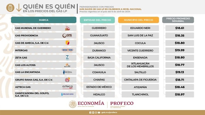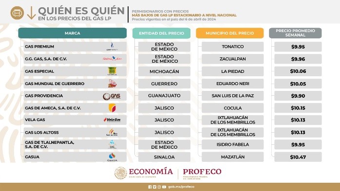 La Procuraduría Federal del Consumidor (Profeco), difundió su informe "Quién es Quién en los precios del gas LP. Al corte del 6 de abril de 2024, estas son las marcas de gas LP en Jalisco, que se posicionan a nivel nacional con los precios más bajos.Gas de Ameca, S.A de C.V ubicada en Cocula tiene un precio promedio semanal de 10 pesos con 15 centavos.Vela Gas, ubicada en Ixtlahuacán de los Membrillos tiene un precio promedio semanal de 10 pesos con 13 centavos.Gas Los Altoss, ubicada en Ixtlahuacán de los Membrillos tiene un precio promedio semanal de 10 pesos con 13 centavos.Gas de Ameca, S.A de C.V ubicada en Cocula tiene un precio promedio semanal de 18 pesos con 80 centavos.Gas Los Altoss, ubicada en Ixtlahuacán de los Membrillos tiene un precio promedio semanal de 18 pesos con 77 centavos. *Mantente al día con las noticias, únete a nuestro canal de WhatsApp aquí: https://whatsapp.com/channel/0029VaAf9Pu9hXF1EJ561i03MV