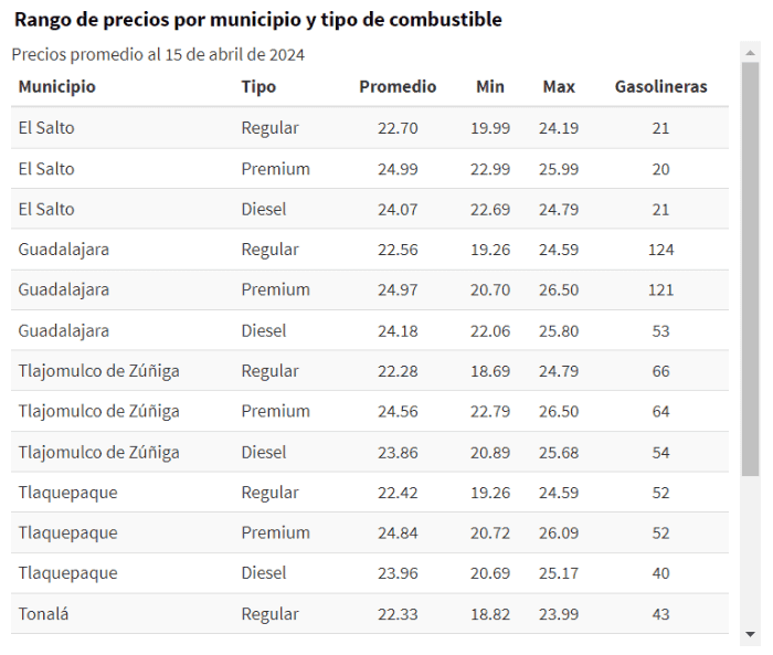 El Instituto de Información Estadística y Geográfica de Jalisco (IIEG), detalla los precios de combustible en el los municipios de la Zona Metropolitana de Guadalajara (ZMG).En este portal, puedes consultar los precios de combustible de los seis principales municipios: Guadalajara, Tlajomulco, Tlaquepaque, Tonalá, Zapopan y El Salto. La información presentada, se actualiza de manera diaria por las mañanas con información de la Comisión Reguladora de Energía (CRE), por lo que esta información corresponde a los precios de este lunes 15 de abril de 2024.En esta sección de la página del IIEG, podrás encontrar el precio promedio diario de la gasolina (regular, premium y del diésel), el precio promedio por municipio y los precios de estos tres tipos de combustible.*Mantente al día con las noticias, únete a nuestro canal de WhatsApp aquí: https://whatsapp.com/channel/0029VaAf9Pu9hXF1EJ561i03MV