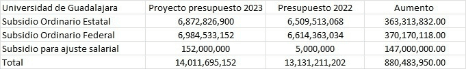 Con un cálculo de ingresos y gastos por 158 mil 630 millones 431 mil 6 pesos, el Gobierno de Jalisco hizo público el contenido del paquete económico estatal para 2023.Las iniciativas fueron presentadas ante el Congreso de Jalisco la noche del martes, pero el secretario de hacienda, Juan Partida se negó a dar detalles sobre la propuesta. Fue hasta que el gobernador publicó un video en sus redes sociales cuando se informó el monto y aspectos generales como que el cobro de impuestos y derechos estatales tendrían aumentos conforme a la inflación, pero descartaron creación de nuevos gravámenes.El titular del Poder Ejecutivo estatal refirió que pretenden incrementar 16% la recaudación propia con mayor eficiencia en el cobro. Añadió que los recursos federales aumentarían 12 por ciento.“Representa un incremento de 21 mil 511 millones de pesos que van a ser destinados a los proyectos estratégicos que se han definido en materia de educación, salud, seguridad, de gasto social, infraestructura carretera; las grandes apuestas del gobierno”, dijo.En el caso de la Universidad de Guadalajara, el gobernador destacó que programaron 889 millones de pesos adicionales a lo que recibió este año y aseguró que aportan más recursos de lo que les corresponde legalmente por el convenio con el Gobierno Federal.“Estamos manteniendo el compromiso de aportar más recursos de lo que nos toca por el convenio con la Federación. Este convenio establece 48% el Estado y 52% la Federación, en este proyecto de presupuesto estamos aportando básicamente 50 y 50, es decir, sólo del subsidio para operación estamos aportando 426 millones de pesos más de lo que deberíamos de aportar como obligación”, sostuvo.En el proyecto de gasto, la Universidad de Guadalajara tiene etiquetados 6 mil 872 millones de subsidio estatal ordinario, más 152 millones para ajuste salarial. Por parte del Gobierno Federal recibiría 6 mil 984 millones.El Congreso de Jalisco debe sesionar para darle entrada formal al proyecto de presupuesto y Ley de Ingresos. El 15 de diciembre es la fecha límite para que el Poder Legislativo lo apruebe.GC