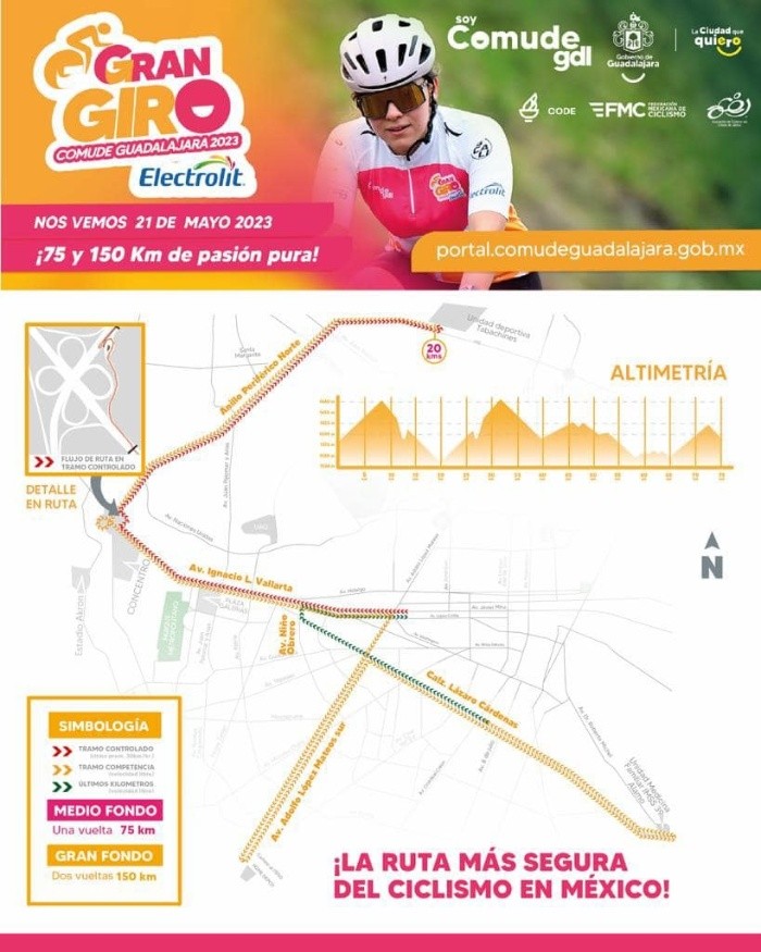Será el próximo domingo cuando se desarrolle en la Zona Metropolitana de Guadalajara el Gran Giro 2023, la competencia ciclista más esperada del año.Por ello, las autoridades municipales y estatales prevén diversos cierres viales en la Zona Metropolitana de Guadalajara que comenzarán desde la tarde del próximo sábado, información que deberá ser considerada por las y los ciudadanos para prever sus traslados este fin de semana.De forma general, el Consejo Municipal Del Deporte de Guadalajara (Comude) adelantó que se llevarán a cabo cierres viales en el Periférico Norte, de la Unidad Deportiva Tabachines, a la avenida Vallarta, y de este cruce hasta llegar a la avenida López Mateos. Una vez en López Mateos se tendrán cierres hacia el sur, hasta llegar al Periférico.Por último, informó que además se presentarán cierres a la circulación por Lázaro Cárdenas, desde la Unidad Médica Familiar 39 del IMSS, en el Álamo, hasta Niño Obrero, y sobre Niño Obrero hasta la avenida Vallarta. Entre las rutas alternas que se tienen para la circulación de la ciudad se encuentran avenidas como la avenida Juan Pablo II, Santa Margarita, Juan Palomar y Arias, Naciones Unidas, la avenida México, Washington, avenida Guadalupe, Colón, Federalismo y 8 de Julio.Aunque de manera preliminar se conoce que las avenidas que presentarán cierres podrían tener al menos el carril de extrema derecha libre para no congestionar el tráfico, será mañana viernes cuando la Policía Vial dé a conocer los cierres y horarios oficiales, así como la exactitud de las vías que podrían ser consideradas como ruta alterna.FS