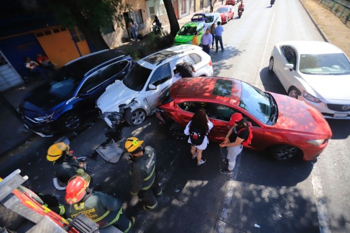 La coordinación de Protección Civil y Bomberos de Guadalajara informó acerca de un choque entre cinco vehículos particulares sobre la avenida Colón, esquina con calle Pino, en la colonia del Fresno.A pesar de los daños materiales, en el reporte no hay personas lesionadas.A través de redes sociales, el primer oficial de Bomberos, Gonzalo González, señaló que derivado de un reporte elementos de la corporación acudieron al auxilio de los involucrados y tareas de saneamiento de sólidos en el sitio mencionado.Precisó que además de verificar que no había lesionados por el siniestro, los conductores involucrados aseguraron haber recibido una primera atención por parte de Cruz Verde, sin necesidad de traslados a unidades médicas.Los elementos en la zona ya realizan las tareas de limpieza derivado del accidente.