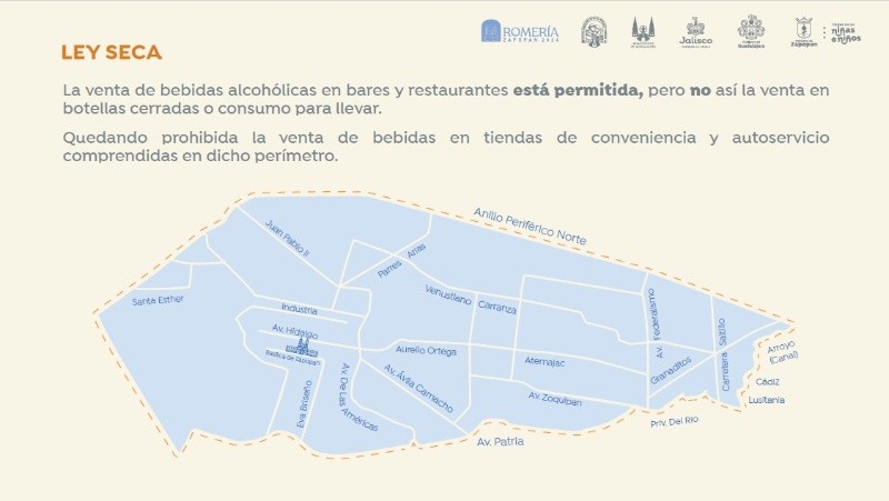 Debido a la celebración de la Romería en su edición 2024, el ayuntamiento de Zapopan impondrá ley seca en el cuadrante cercano a la realización de la peregrinación.El alcalde zapopano, Juan José Frangie, informó que esto se llevará a cabo con el objetivo de preservar el orden en la celebración, por lo cual, las restricciones comenzarán desde la noche del jueves en el primer cuadro del centro de Zapopan.Posteriormente, desde la noche del viernes se extenderá la restricción al polígono que comprende de Periférico a avenida Patria y de Santa Esther a Arroyo Hondo, informó este lunes Frangie Saade en rueda de prensa.Los negocios dentro de estas zonas mencionadas tendrán prohibida la venta de bebidas alcohólicas en botellas cerradas durante la Romería y hasta que esta concluya, incluyendo por ejemplo tiendas de conveniencia, de autoservicio, vinaterías, tienditas barriales, entre otros.Solo se permitirá a los restaurantes establecidos en esta zona seguir vendiendo bebidas dentro de sus establecimientos como parte del consumo de las y los comensales, pero no está permitida la venta al público para su consumo en el exterior de los negocios. Por ahora la medida solo aplica para el ayuntamiento de Zapopan, por lo que el desarrollo del comercio en el municipio de Guadalajara continuará de manera habitual hasta nuevo aviso. YC