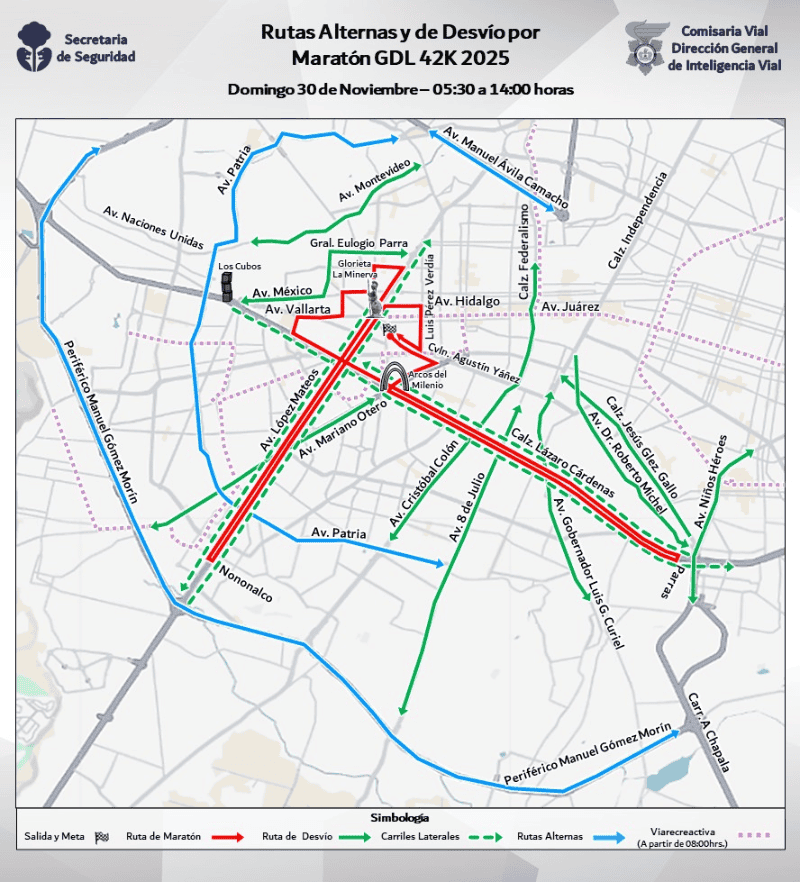 Los cierres viales iniciarán en avenida Circunvalación Agustín Yáñez, entre avenida de la Paz y avenida de los Arcos. X&@Maraton_Gdl
