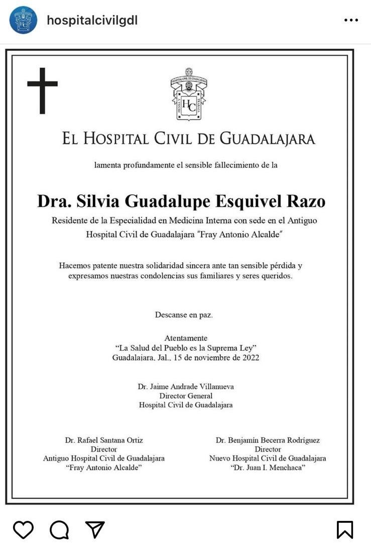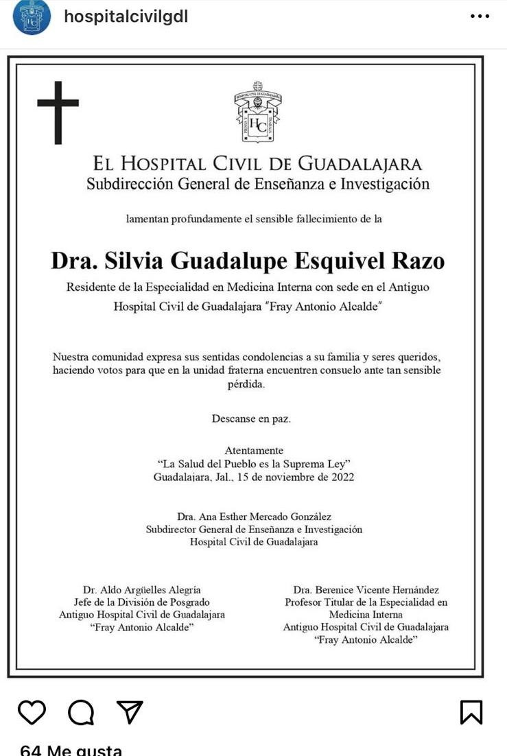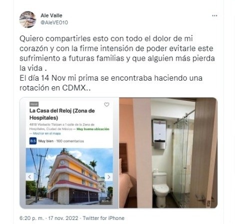 Hace unos días falleció en la Ciudad de México (CDMX) la médica tapatía, residente del Hospital Civil, Silvia Guadalupe Esquivel de 27 años.Sus familiares dieron a conocer que murió el 14 de noviembre en la habitación de un hotel ubicado en José María Morelos 187, esquina con Viad. Tlalpan, Niño de Jesus, en la capital del país. La razón fue negligencia del hotel debido a intoxicación por monóxido de carbono.Silvia se encontraba en esa ciudad como parte de su labor como médica en rotación."El cuarto tenía el boiler en el baño y no contaba con ventilación de ningún tipo, esto hizo que perdiera la vida. Antes de mi prima ya otra persona había perdido la vida y múltiples casos de intoxicación y denuncias del lugar pero los dueños no hicieron nada, no se hicieron responsables de ninguna de las denuncias no les importó que esto cobró la vida de mi prima", señaló Alejandra Valle, prima de la joven doctora fallecida.En sus redes sociales, su prima solicitó en un tuit "la difusión para que nadie más se hospede ahí nada nos podrá regresar a nuestra Chivis pero al menos podemos evitar que alguien salga herido y que se hagan responsables de su negligencia"."Por favor, pedimos de su apoyo, este lugar es un peligro para las personas ya han tenido muertes y no se quieren hacer responsables de arreglar sus anomalías".Sin embargo, el tuit se hizo viral y levantó gran indignación por parte de usuarios de la red social que lamentaron la muerte de la médica tapatía, quien se encontraba en la Ciudad de México haciendo una rotación en otro hospital de ese Estado.El tuit, publicado el 17 de noviembre, tiene casi 22 mil mil likes y más de 10 mil 300 retuits, así como cientos de comentarios."Lamento mucho e indigna la muerte de tu prima. Es muy grave, no puede ser solo una queja. Es una vida y otras más que seguramente no se conocen o han dejado pasar", comentó Alejandra con el usuario @guanxi27"."Pues ese hotel ya lo deberían de haber clausurado. Cómo es posible que siga funcionando sin las medidas de seguridad necesarias! Deberían de poner una denuncia". refirió @Mabis41."Pedimos justicia!!! Chivis no merecía morir y menos teniendo su rotación como médico en CDMX, que clase de viviendas están aprobadas!!! Esto es un riesgo para todos! El lugar sigue abierto, con más muertes en puerta!!", comentó @bylittlefer. La denunciante señaló que en páginas donde se hacen reseñas de hoteles ya había reportes previos por situaciones similares cuando la gente rentaba las habitaciones.Varios huéspedes señalaron haber tenido problemas por el tema del boiler dentro de la habitación:"Confirmo, en el mes de Septiembre me hospedé ahí y lo reportamos múltiples veces, dizque lo arreglaban pero siempre que nos bañábamos estaba ese olor", señaló una usuaria en su cuenta @ghelQ como respuesta al tuit."Yo no mas percibía el olor. Capaz y la ultima noche la persona a qué se llevaron al hospital era por eso", dijo @ReyJuck. “Me intoxiqué con el gas y acabé en el hospital porque el calentador está dentro de la habitación y no tiene ventilación el baño, pésima instalación. ESTUVE EN RIESGO DE MUERTE”, escribió una persona el 25 de julio de 2022.El 22 de marzo de este año, otra persona señaló: “La ubicación del boiler dentro del baño es un ALTO RIESGO. ME INTOXIQUÉ con el monóxido de carbono, ya que no cuenta con ventilación. No me advirtieron sobre dejar la puerta abierta. Este problema ya se ha reportado anteriormente y no se ha dado una solución a pesar del riesgo. Yo tuve mareos al salir de bañarme y vomité. Después tuve dolor de cabeza todo el día”.“Que los calentadores estuvieran dentro del cuarto de baño, me parece algo inseguro”, dijo otro usuario el 27 de septiembre de 2021. El pasado 15 de noviembre, el Hospital Civil lamentó la muerte de la médica residente especialista en medicina interna Silvia Guadalupe Esquivel Razo.A nombre de la institución ofrecieron su solidaridad y dieron a conocer las condolencias hacia los familiares y seres queridos de la doctora conocida como "Chivis".