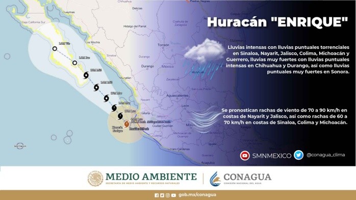 El huracán "Enrique", en la categoría 1 en la escala Saffir Simpson, se encuentra muy cerca de la costa de Jalisco y ocasiona lluvias torrenciales, vientos fuertes y oleaje elevado en el estado y entidades costeras, informó este lunes el Servicio Meteorológico Nacional (SMN).Mientras que Protección Civil y Bomberos Jalisco informó que tras el avance de "Enrique" frente al estado, se bajó el nivel de peligro del Sistema de Alerta Temprana para Ciclones Tropicales en etapa de alejamiento.La alerta verde, que indica peligro bajo, quedó para Tomatlán y Cabo Corrientes.Mientras que la alerta azul, de peligro mínimo, se dictaminó para la Costa Sur y Puerto Vallarta.Autoridades de Jalisco habían elevado anoche la alerta naranja para el municipio de Cabo Corrientes y la amarilla para el resto de las costas de Jalisco.En su reporte de las 10.15 hora del centro de México, el SMN dijo que las bandas nubosas del huracán 'Enrique" provocan lluvias "intensas y torrenciales" en Jalisco, Sinaloa, Nayarit, Colima, Michoacán y Guerrero; lluvias "muy fuertes e intensas" en Chihuahua y Durango y lluvias "puntuales muy fuertes" en Sonora.El sistema se encuentra a 105 kilómetros al oeste de Cabo Corrientes, en Jalisco, y a 430 kilómetros al sureste de Cabo San Lucas, en Baja California Sur, en el noroeste del país.Se mueve hacia el nor-noroeste a 7 kilómetros por hora, una baja frente a los 9 km/h indicados en el reporte de las 7:00horas, y registra vientos sostenidos de 140 kilómetros por hora y rachas de 165 kilómetros por hora. El Meteorológico indicó que las lluvias "podrían acompañarse de descargas eléctricas y fuertes vientos, además de incrementar los niveles de ríos y arroyos, deslaves e inundaciones en zonas bajas de terreno".Además, debido a la intensidad del viento, "se pronostica olaje muy elevado en las costas de Baja California Sur, Sinaloa, Nayarit, Nayarit, Jalisco, Colima, Michoacán y Guerrero", indicó este lunes en conferencia de prensa Alejandra Margarita Méndez, coordinadora del SMN."El huracán Enrique se ubica al occidente de las costas de Jalisco y se espera que continúe con su movimiento lento hacia el oeste-noroeste en el trascurso de este día lunes", dijo Méndez.El Meteorológico pidió "extremar precauciones a la población en general en las zonas de los estados mencionados por lluvias, viento y oleaje".Según el pronóstico, el huracán se debilitará en las próximas horas mientras se dirige hacia la península de Baja California, donde tocaría tierra en la mañana del 30 de junio como tormenta tropical.La temporada de lluvias y ciclones tropicales 2021 comenzó oficialmente el pasado 15 de mayo y se estima que finalice en noviembre.Por el momento, se han formado en el Pacífico los ciclones "Andrés", "Blanca", "Carlos", "Dolores" y "Enrique"."Dolores" tocó tierra el pasado 19 de junio impactando especialmente en los estados de Colima y Michoacán y dejó tres muertos por tormentas eléctricas. Con información de EFEIM