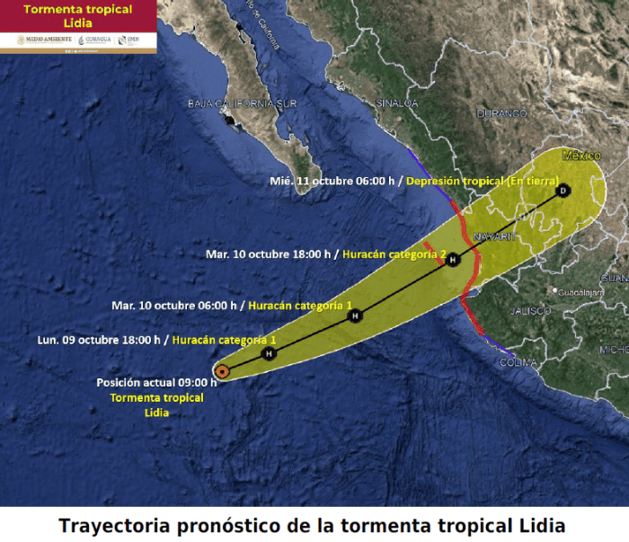"Lidia" se convertirá en huracán y podría alcanzar la categoría 2, según el pronóstico que elaboró el Servicio Meteorológico Nacional (SMN), fuente climática oficial del Gobierno de México, este lunes 9 de octubre; el ciclón podría impactar en algún punto de Jalisco.Hasta las 09:00 horas de hoy, el aviso del SMN informaba que la amplia circulación de la tormenta tropical "Lidia" reforzará la probabilidad de lluvias muy fuertes a puntuales intensas en Baja California Sur, Sinaloa, Nayarit y Jalisco, además se prevé viento con rachas fuertes y oleaje elevado en costas de Baja California Sur.El sistema se encuentra a 525 km al sur-suroeste de Cabo San Lucas, Baja California Sur, y a 675 km al oeste suroeste de Cabo Corrientes, Jalisco.Se establece zona de prevención por efectos de huracán desde Playa Pérula, Jalisco, hasta Escuinapa, Sinaloa, incluidas las Islas Marías, Nayarit; y zona de prevención por efectos de tormenta tropical desde Escuinapa hasta Bahía Tempehuaya, Sinaloa, y desde Manzanillo, Colima, hasta Playa Pérula, Jalisco.De acuerdo a la previsión, "Lidia" alcanzará la categoría 1 como huracán alrededor de las 06:00 horas de mañana martes 10 de octubre, cuando se encuentre a 290 km al oeste de Cabo Corrientes, Jalisco, y a 345 km al oeste de Playa Perula, Jalisco.Pero será hasta las 18:00 horas, del mismo martes, cuando "Lidia" sea huracán categoría 2, el nivel más alto que se le pronostica, cuando esté localizado a 65 km al oeste-suroeste de San Blas, Nayarit, y a 110 km al nornoroeste de Cabo Corrientes, Jalisco.Ya para el miércoles 11 de octubre, se convertiría en depresión tropical, cuando esté en tierra sobre Zacatecas.Autoridades piden extremar precauciones a la población en general en las zonas de los estados mencionados por lluvias, viento y oleaje (incluyendo la navegación marítima) y atender las recomendaciones emitidas por las autoridades del Sistema Nacional de Protección Civil, en cada entidad.Con información del Servicio Meteorológico NacionalOA