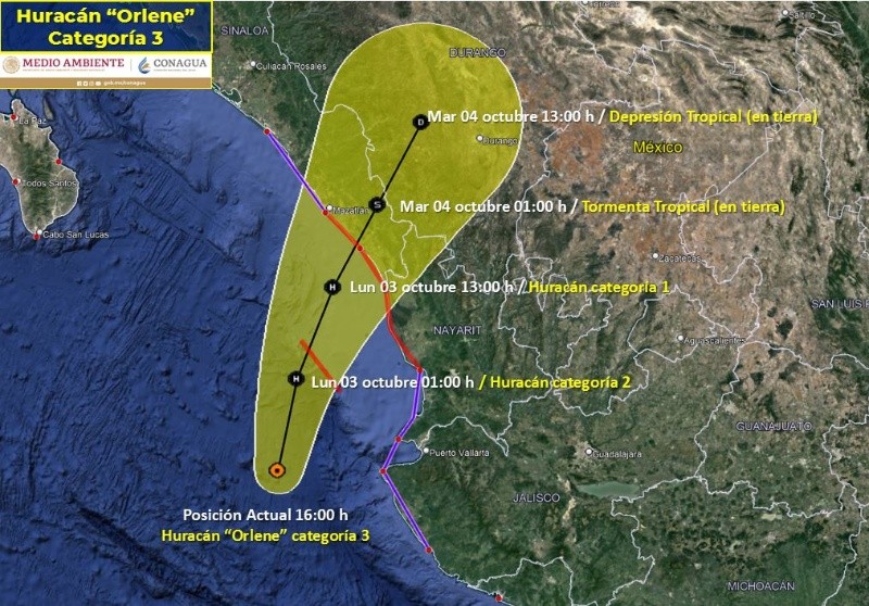 El gobernador de Jalisco informó quedebido al paso del Huracán "Orlene" de categoría 3 que pasará a 100 kilómetros de Cabo Corrientes se determinó suspender clases este lunes 3 de octubre.“Se han desplegado 300 oficiales operativos y distintas dependencias para prevenir ante cualquier contingencia, con especial atención en la Costa Norte y Costa Sur, en donde las navegaciones fueron suspendidas; así como monitoreo permanente en Sierra Occidental y Sierra de Amula”, publicó el mandatario en sus redes.Esta medida aplica para todos los niveles de educación básica, media superior y superior, confirmó la Secretaría de Educación Jalisco.La Universidad de Guadalajara también determinó la suspensión de actividades académicas en estos mismos municipios. El huracán "Orlene", actualmente de categoría 3, se ubica a 135 kilómetros al oeste-suroeste de Cabo Corrientes, Jalisco, con vientos sostenidos de 185 km/h con rachas de 220 km/h.Las bandas nubosas del huracán "Orlene", indica el Servicio Meteorológico Nacional (SMN), ocasionan lluvias intensas a puntuales torrenciales, vientos intensos y oleaje elevado en costas del occidente del país, incluido Jalisco. Las lluvias pronosticadas podrían originar incremento en los niveles de ríos y arroyos, deslaves e inundaciones en zonas bajas de los estados indicados.Además, la Unidad Estatal de Protección Civil y Bomberos de Jalisco invitó a la población de otros municipios a extremar precauciones y a mantenerse informados, frente a el paso de “Orlene” ya que las bandas nubosas de dicho fenómeno podrán traer consigo lluvias de moderadas a fuertes acompañadas de rachas de viento que pudieran ir de entre los 40 y 60 km/h.La Coordinación Nacional de Protección Civil del Gobierno Federal recomendó a residentes de zonas donde se acerca el fenómeno natural lo siguiente: • Evacuar zonas de riesgo y acudir al refugio temporal si tu vivienda no es segura. • Vigilar el nivel del agua si vives cera de un cuerpo de agua. • Cerrar puertas y ventanas y cortar el suministro de gas y electricidad. OF