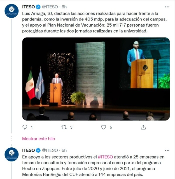 En su informe del ciclo escolar 2020-2021 del rector del Instituto Tecnológico y de Estudios Superiores de Occidente (ITESO), Luis Arriaga Valenzuela, detalló que una las estrategias institucionales con enfoque al 2026 es internacionalizar al ITESO con una red de universidades.Arriaga, como presidente de la Asociación de Universidades Confiadas a la Compañía de Jesús en América Latina (AUSJAL), recientemente firmó un convenio de colaboración con la University Network for Human Rights para la formación de estudiantes de universidades jesuitas en América Latina en proyectos de litigio estratégico internacional, en el que participan universidades como Harvard, Stanford, Yale, La Soborna, do Vale do Rio dos Sinos y Católica de Pernambuco.“Hemos definido hacia dónde va nuestra universidad, nuestra prioridad será profundizar en la excelencia académica, la identidad ignaciana y la incidencia social y ambiental con la generación de conocimiento vía a la investigación colaborativa y de calidad, para lograrlo establecimos tres líneas transversales, uno internalización, dos administración sostenible, y tres innovación transformación digital”, dijo el sacerdote jesuita, abogado y doctor en educación.Además, Arriaga Valenzuela destacó que también recientemente se firmó un convenio de colaboración para el intercambio estudiantil, docente y colaboración académica con la Unión de Universidades de América Latina, la más antigua y consolidada red universitaria de la región.El rector también se mostró satisfecho de toda su labor durante todo este tiempo y principalmente como llevaron el proceso de readaptación estudiantil durante la pandemia de COVID-19.“Hoy tengo la dicha de cumplir tres años ya como rector y me siento sumamente agradecido, de los avances que ha habido como rector del Iteso. Lo principal es como el Iteso buscó adaptarse de forma creativa y con un gran sentido de resiliencia, como seguir adelante con la vida universitaria y como avanzar en la atención de las necesidades y problemas que se agudizaron durante la pandemia de COVID-19”, acotó.Si te interesó esta noticia y quieres saber más, entonces descarga y descubre INFORMAPlus, la aplicación digital de EL INFORMADOR, en donde tenemos contenidos exclusivos, seleccionados por nuestros editores, para darles una experiencia más completa a los lectores. Si eres suscriptor de EL INFORMADOR tu acceso está incluido, solicítalo al 33 3678-7777.Descarga la aplicación y pruébala GRATIS por treinta días.Para iOS: https://apple.co/35jaVgbPara Android: https://bit.ly/3gwVSEVJM