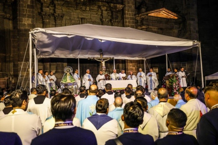 Con la tradicional misa de patrocinio, celebrada en esta ocasión frente a la Catedral de Guadalajara, inició oficialmente la edición número 291 de la Romería de la Virgen de Zapopan. Miles de fieles se dieron cita en el Centro de Guadalajara para rendir homenaje a La Generala, la patrona de la Arquidiócesis de Guadalajara y de los tapatíos en uno de los eventos más importantes para la comunidad católica. En esta ocasión, la misa se celebró en la explanada de la Catedral sobre Paseo Alcalde, a diferencia de años anteriores que se realizaban en la explanada del Hospicio Cabañas, esto debido a las obras de remodelación del Centro de Guadalajara. El sitio permitió que los asistentes al primer cuadro de la ciudad acá acudieran a la misa. La misa, celebrada desde las 18:00 horas, fue presidida por el arzobispo de Guadalajara, cardenal Francisco Robles Ortega, quien fue acompañado de obispos auxiliares, coro y orquesta. En múltiples ocasiones, los asistentes lanzaron consignas como "¡Viva la Virgen de Zapopan!", "¡Viva la Generala!", "¡Viva Cristo Rey!", entre otras, así como aplausos para la imagen religiosa. La homilía fue dicha por el Monseñor Héctor López Alvarado, obispo auxiliar de Guadalajara, quien resaltó la entrega de la imagen de la Virgen hace 483 años al pueblo de Zapopan. Y reconoció las problemáticas que enfrenta la sociedad mexicana, pero también por el planeta. "El mundo y la sociedad se enfrentan a grandes desafíos. La injusticia, la presencia de la cultura de la muerte, la violencia, las guerras, la inseguridad, las desapariciones, polarización, la descomposición del tejido social, la pérdida de valores humanos y cristianos son ciertas realidades que lamentablemente a veces pueden parecer que nos quitan la paz y que nos sumergen en la desesperanza". Por lo tanto, el religioso agradeció la protección de la Virgen y pidió su intercesión por las necesidades de la comunidad, resaltando su papel como “La Pacificadora” en tiempos de violencia. También recordó que se cumplen 36 años desde que fue nombrada patrona universal de la Arquidiócesis por el Papa Juan Pablo II. Con el lema de esta edición “Madre de Cristo Sacerdote y Señora de la Esperanza”, los organizadores invitaron a los fieles a reflexionar sobre la misericordia y compasión de Dios. El religioso propuso tres compromisos a los asistentes: vivir con esperanza activa, que se levanta y trabaja por la paz; ser testigos de misericordia; y caminar con María e imitarla. La Romería implica importantes afectaciones en la movilidad de la ciudad. Tras la eucaristía, la Virgen pasó la noche en espera de la misa de despedida, que se celebró a las 05:00 horas en la Catedral de Guadalajara. Posteriormente, comenzó la procesión de regreso a la Basílica de Zapopan. Debido a la multitudinaria participación en el evento, las autoridades locales anunciaron varios cierres viales en el trayecto de la Virgen. Desde la madrugada, vialidades principales como avenida Alcalde, Américas, y Patria están cerradas al tráfico.La ruta de la Romería se da desde Paseo Alcalde hasta Juárez / Vallarta, posteriormente toma avenida Américas y se llega a Los Arcos de Zapopan y por el Andador 20 de Noviembre se dirige rumbo a la Basílica de Zapopan; por lo tanto, se recomienda a los ciudadanos evitar la zona y utilizar rutas alternas. El operativo de seguridad para la Romería cuenta con más de 7 mil elementos de distintas corporaciones. Además, hay módulos de atención médica y puntos de hidratación para asegurar el bienestar de los asistentes. Autoridades piden a los fieles seguir las indicaciones del personal de seguridad y respetar las zonas delimitadas para evitar accidentes. YC