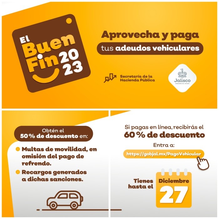 ¿Tienes multas vehiculares, o cargos por no haber pagado el refrendo anual correspondiente?Durante el Buen Fin 2023, el Gobierno de Jalisco presentó varios descuentos con los cuales se invita a los tapatíos a saldar estas deudas. Y si bien la temporada del Buen Fin finalizó, la promoción sigue vigente, por lo que esta es una oportunidad que no puedes dejar pasar si es que quieres estar al corriente de tus pagos, y además con un descuento.El Gobierno de Jalisco ofrece el 50% de descuento en los siguientes adeudos vehiculares:Además, si es que el usuario decide pagar en línea, el descuento aplicado será del 60%. La página oficial para hacer el pago es en el siguiente enlace: https://gobjal.mx/PagoVehicularLa promoción estará disponible hasta el 27 de diciembre. El pago puede realizarse en cualquier recaudadora del estado de Jalisco, además de tiendas de conveniencia y autoservicio. FS