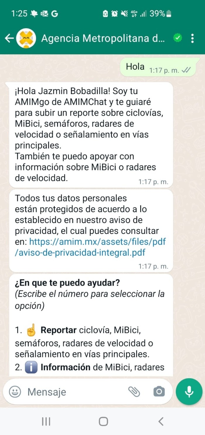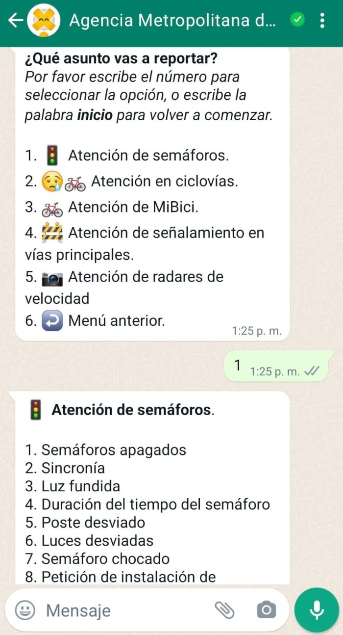 Un nuevo canal de comunicación se suma a la atención ciudadana de la Agencia Metropolitana de Servicios de Infraestructura para la Movilidad en el AMG (AMIM) para realizar reportes ciudadanos sobre fallas en la infraestructura o señalamientos relacionados con la movilidad de la ciudad.Ahora, las y los ciudadanos podrán hacerlo mediante la aplicación de mensajería instantánea de WhatsApp, donde se podrán levantar reportes sobre semáforos descompuestos o descoordinados, señalamientos en mal estado, fallas del Programa de Bicicletas Públicas MiBici, o en ciclovías. “La AMIM se suma a las dependencias que buscan una innovación y automatización en la atención a los reportes ciudadanos. Desde cualquier teléfono móvil que tenga la aplicación de WhatsApp se podrá acceder al nuevo chat “AMIMgo” para hacer un reporte y dar seguimiento personalizado, además de chatear directamente con personal encargado de dar una atención directa”, dio a conocer este lunes la dependencia estatal. El ChatBot ya está disponible en WhatsApp, se puede ingresar dando clic en la opción “nuevo chat”, seleccionar “empresas” y buscar el perfil de la Agencia Metropolitana. Ahí la primera opción es el ChatBOT de la AMIM, pero también se puede agregar como contacto en el número 33-15-14-56-14 o de forma más sencilla en el siguiente enlace: https://wa.me/5213315145614 “AMIMgo” es el asistente virtual que guiará paso a paso para levantar un reporte y dar un seguimiento al mismo. Según dijo la AMIM, la respuesta a cada reporte será inmediata y los usuarios tendrán un número de folio para dar seguimiento a sus reportes, accediendo a la página https://chat.amim.mx para consultar el estatus de los mismos con su folio correspondiente. De acuerdo al Estudio sobre los hábitos de personas usuarias de internet en México 2022, de la Asociación de Internet en México, el smartphone es el principal punto de acceso a internet y WhatsApp es la plataforma con mayor conocimiento y uso para una comunicación inmediata. Sin embargo, esta no es la única vía para hacer los reportes ciudadanos relacionados con la infraestructura destinada a la movilidad de la ciudad. Además de este nuevo chat se seguirán recibiendo los reportes en las redes sociales de la AMIM @AgenciaAMIM y en los teléfonos en cabina de semáforos 33 38192400 y 3338192412. ¡Mantente informado! Sigue nuestras noticias y actualizaciones a través de nuestro canal oficial de WhatsApp FS