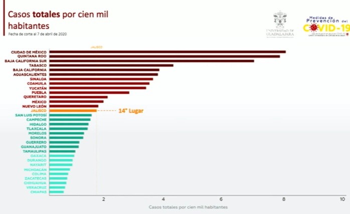 Con base en las cifras de casos confirmados en el reporte epidemiológico de COVID-19 de la Secretaría de Salud federal, la Sala de Situación de Salud de la Universidad de Guadalajara (UdeG) afirmó que Jalisco ha conseguido achatar la curva de contagios y avaló el nuevo modelo de muestreo del gobierno estatal.El rector de la UdeG, Ricardo Villanueva Lomelí, afirmó que la propuesta de llevar a cabo pruebas en casos sospechosos, contribuirá a mejorar la estrategia para combatir la enfermedad y otorgará datos "más precisos y no sólo un caso documentado y 8.34 que no".La casa de estudios había anunciado un seguimiento de su modelo predictivo el 29 de abril, pero lo adelantaron nueves días para "un mejor análisis de la estrategia" y otorgar datos cerca del cambio de medición en personas sospechosas de estar contagiadas de COVID-19, afirmó el rector.En la presentación de cifras, se expuso que Jalisco se encuentra en el sitio 14 del país en casos totales por cada 100 mil habitantes, después de estar varios días en segundo sitio, además la entidad se encuentra en el lugar 6 de casos importados por 100 mil habitantes.Villanueva reiteró el llamado a evitar mayores casos importados: "Ha sido una exigencia de esta mesa, de la Universidad y del propio Gobierno del Estado, que se frenen los flujos áereos con ciudades que tienen cercos sanitarios. Es algo que no se ha podido lograr, pero yo insistiría en que el Gobierno federal debe repensar el tema de los flujos de viajeros internacionales porque sigue siendo una fuente de contagio". "Jalisco pasa el lugar 17 en contagios comunitarios. Este dato como haber suspendido clases y eventos masivos, llegamos al lugar 17, gracias que los ciudadanos han ayudado a contener esto, ha valido la pena este mes de anticipaciones", especificó.La Sala de Situación de Salud de la UdeG dio a conocer que los casos importados de COVID-19 representa el 51% del total y los casos comunitarios 49%, lo que significa un mantenimiento de la curva de contagio con menor ascendencia."Esto nos dice por qué estamos achatando la curva, porque no nos estamos contagiando aquí, los contagios siguieron siendo de fuera y gracias al aislamiento no siguió creciendo nuestra curva", afirmó.El modelo predictivo de la casa de estudios estimó que del 40% de personas que estaban aisladas el 28 de marzo, pasó a un 54% el 9 de abril, lo que ha dado como resultado 139 personas enfermas de COVID-19, aunque las autoridades lamentaron que ciudadanos hayan salido de viaje o provocado concentraciones en mercados en la última semana.A pesar de mostrar datos positivos, las autoridades universitarias consideraron prematuro asegurar una fecha para terminar el aislamiento social, pero sostuvieron que la población debe mantenerse en casa y se debe aumentar la cantidad de población a la que se le practiquen pruebas rápidas para reducir contagios.