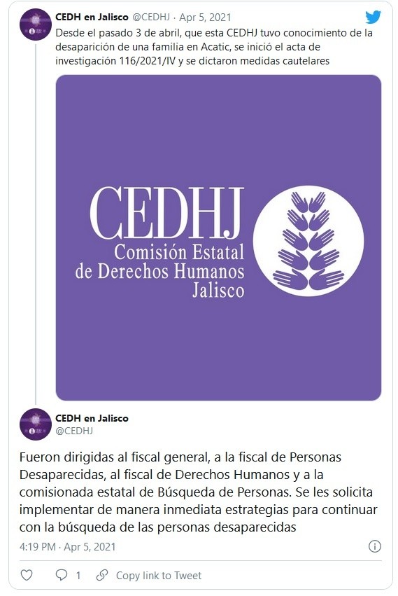 Por la desaparición de una familia de cinco integrantes de quienes se perdió el rastro cuando llegaban a Jalisco provenientes de la Ciudad de México, la Comisión Estatal de Derechos Humanos Jalisco (CEDHJ) dictó medidas cautelares a las dependencias relacionadas con la búsqueda de personas desaparecidas.A través de sus redes sociales, la Comisión informó que desde que se tuvo conocimiento de la desaparición de Jimena y Julio, su pareja, quienes viajaban acompañados de Julia, su hija, y de Virginia, hermana de Julio, así como del hijo de ella de nombre Iker, se inició el acta de investigación 116/2021/IV y se dictaron medidas cautelares.Dichas medidas, detalló, fueron dirigidas al fiscal general, Gerardo Octavio Solís; a la fiscal Especializada en Personas Desaparecidas, Blanca Trujillo; al fiscal de Derechos Humanos, Jorge Alejandro Góngora, y a la comisionada Estatal de Búsqueda de Personas, Francelia Hernández.A las y los titulares se les solicitó implementar de manera inmediata estrategias para continuar con la búsqueda de las personas desaparecidas, así como garantizar a las víctimas directas e indirectas el cumplimiento de los protocolos aplicables con la máxima diligencia en el servicio público y salvaguardar la integridad física y seguridad personal de las víctimas indirectas.También se les pidió que por los conductos legales, se proporcione a las víctimas indirectas la información obtenida dentro de la carpeta de investigación, y se les permita coadyuvar en la integración, al recibir y desahogar los datos de prueba que ofrezcan para la investigación de los hechos.Por último, dijo el organismo, se solicitó que a través de la Comisión Ejecutiva Estatal de Atención a Víctimas, se asigne un asesor jurídico y se brinden las medidas de ayuda, asistencia y atención a las víctimas indirectas.De acuerdo con la Fiscalía Estatal, ayer domingo se realizó la detención de siete policías de Acatic, quienes presuntamente participaron en la desaparición forzada de la familia, de quien se desconoce su paradero desde el pasado 24 de marzo.La dependencia aseguró que su búsqueda continúa en coordinación con alrededor de 200 agentes de los tres órdenes de Gobierno y que “se tiene la esperanza de encontrarlos con bien”, por lo que su búsqueda se ha centrado en brechas y localidades apartadas de ese municipio.JM