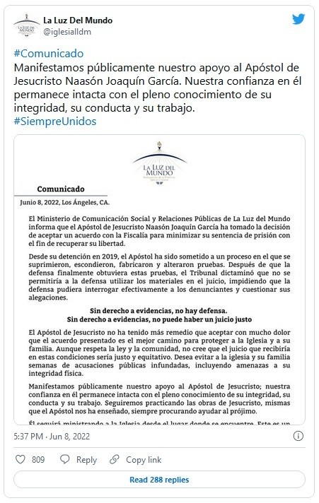 Integrantes de la iglesia La Luz del Mundo manifestaron la tarde de este miércoles su apoyo para el líder Naasón Joaquín García, quien fue condenado a 16 años y ocho meses de prisión por delitos de abuso sexual y posesión de pornográfica infantil.A través de un comunicado, el Ministerio de Comunicación Social y Relaciones Públicas de la iglesia de la Luz del Mundo informó que aceptó la decisión del Fiscal para minimizar la condena de Joaquín García con el fin de que el Apóstol recupere su libertad.El Apóstol fue detenido en 2019, y desde entonces el Ministerio acusó que ha sido sometido a un proceso en el que se suprimieron, escondieron, fabricaron y alteraron las pruebas en su contra. "Sin derecho de evidencia, no hay defensa. Sin derecho a evidencia, no puede haber juicio justo"."El Apóstol de Jesucristo no ha tenido más remedio que aceptar con mucho dolor que el acuerdo presentado es el mejor camino para proteger a la Iglesia y a su familia. Aunque respeta la ley y la comunidad, no cree que el juicio que recibirán en estas condiciones sería justo y equitativo. Desea evitar a la iglesia y su familia semanas de acusaciones públicas difundidas, incluyendo amenazas a su integridad física", indicó en el comunicado.Asimismo, el ministerio manifestó públicamente su apoyo a Joaquín García y señaló que mantiene una confianza intacta hacia el Apóstol y señaló que seguirá practicando las obras de Jesucristo, mismas que Joaquín García ha enseñado.Concluye señalando que Naasón Joaquín seguirá administrando a La Luz del Mundo desde el lugar en el que se encuentre y lo compara con el Apóstol Pablo, quien según la tradición también fue encarcelado."El apóstol trabajará este camino con su fe en Dios y seguirá cumpliendo la misión de Jesucristo: ser la Luz del mundo".JM