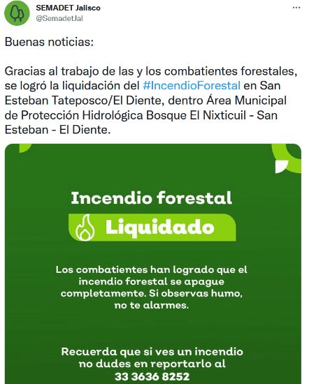 Tras una larga jornada, que comenzó este lunes en la tarde, combatientes forestales de los tres niveles de Gobierno lograron el control de los incendios registrados en puntos de la Zona Metropolitana de Guadalajara (ZMG) y municipios aledaños.En el municipio de Zapopan se combatieron tres incendios en los parajes San Esteban Tateposco / El Diente, El Colli -dentro del Área de Protección de Flora y Fauna (APFF) La Primavera- y el Tepopote; uno en Ixtlahuacán del Río en el paraje La Higuera y uno más en el paraje Los Colomos en el municipio de Tala.Actualmente, el estatus de dichos incendios es el siguiente: San Esteban Tateposco - El Diente y Los Colomos se reportan liquidados, La Higuerilla y Tepopote están controlados, y El Colli se encuentra en fase de contención, por lo que personal de los tres niveles de gobierno continúa con labores de enfriamiento.En total participaron 428 elementos de la Secretaría de Medio Ambiente y Desarrollo Territorial (Semadet), Protección Civil y Bomberos de Jalisco, Zapopan y Guadalajara, la Comisión Nacional Forestal (Conafor), la Brigada 249, el Organismo Público Descentralizado (OPD) Bosque La Primavera, los municipios de Zapopan, Guadalajara, Tala, Tlajomulco de Zúñiga e Ixtlahuacán del Río, la Secretaría de la Defensa Nacional (Sedena), brigadas voluntarias capacitadas, la Junta Intermunicipal de Medio Ambiente de la Región Valles (JIMAV) y Selva Negra.Además, se utilizaron 89 unidades (pipas, motobombas y camionetas Pick Up) y seis aeronaves, Witari y Cuautli de la Semadet, Corsario de Secretaría de Seguridad Pública, Tláloc y Halcón de Zapopan, Zeus de Guadalajara y Palomo de Tlajomulco de Zúñiga.En caso de detectar incendios forestales, reportarlo inmediatamente a las siguientes líneas: 33 3636 8252 (Centro Estatal de Incendios Forestales), 800 737 00 00 y 911. El seguimiento al combate de los incendios se puede consultar en la cuenta de Twitter @SemadetJal.GC
