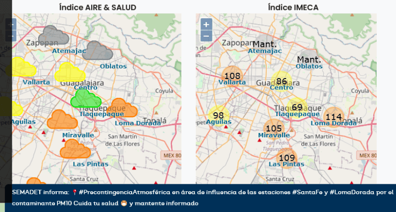 Este sábado, la Secretaría de Medio Ambiente y Desarrollo Territorial (Semadet) desactivó este a las 07:00 horas la Contingencia Atmosférica fase 1 en la zona de influencia de la estación de monitoreo Las Águilas, en el municipio de Zapopan, pasando a fase de Precontingencia Atmosférica. Esta se originó tras la contaminación generada por el incendio en el bosque La Primavera.La contingencia atmosférica fue activada ayer viernes 24 de febrero a las 12:00 horas debido a que dicha estación de monitoreo alcanzó niveles superiores a los 150 puntos IMECA (Índice Metropolitano de la Calidad del Aire).Al corte de esta información también siguen activas las Precontingencias Atmosféricas en la zona de influencia de las estaciones de monitoreo de Santa Fe y Loma Dorada.Las Contingencias Atmosféricas se desactivan luego de que por más de dos horas consecutivas, se registraron niveles por debajo de los 140 puntos IMECA, además se llevó a cabo una verificación de las condiciones meteorológicas para constatar que favorecen la dispersión de contaminantes.Los episodios de mala calidad del aire que se encuentran activos, son por la presencia predominante de partículas menores a 10 micras (PM10).La Semadet recuerda que la mala calidad del aire provoca afectaciones a la salud, especialmente entre grupos vulnerables como: niñas y niños menores de cinco años, personas con enfermedades respiratorias crónicas y adultas mayores.En el último corte, de las 11:00 horas, la Semadet indicó que el nivel máximo de contaminación fue en la estación de Loma Dorada, con 114 puntos IMECA.Cuando se presenta una precontingencia en la Zona Metropolitana de Guadalajara (ZMG), la Semadet recomienda una serie de acciones para reducir la contaminación y proteger la salud:***OF
