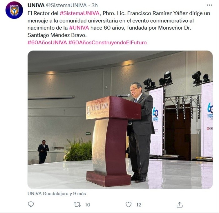 La Universidad del Valle Atemajac está de manteles largos ya que cumplió 60 años de trayectoria y 30 años en la experiencia de educación en línea, ejemplo de constancia y disciplina que permaneció impulsando jóvenes durante la pandemia de COVID-19. Esta mañana en el Salón de Usos Múltiples (SUM), auditorio de la UNIVA, se llevó a cabo una celebración religiosa y posteriormente un acto cívico y protocolario, recordando a diferentes generaciones y congratulando a maestros eméritos.En la eucaristía, el arzobispo Francisco Robles Ortega encomendó a la universidad católica en su aniversario a que siga formando jóvenes con humanismo, para tener una sociedad más armónica y capacitada.“Que esta universidad siga creciendo, construyendo vidas y personas que se proyecten en todos los campos de la actividad humana y que enriquezcan a todas las instituciones de donde los que aquí salen se sumen, se integren, solamente así sabemos que se trata de un proyecto principal, proyecto humano, proyecto de iglesia, de convicción cristiana, por eso nuestra acción de gracias”, comentó.En el evento protocolario, el presbítero licenciado Francisco Ramírez Yáñez, rector de la UNIVA, brindó algunas palabras y destacó a cada una de las personas que han sido parte de la historia de la institución.“Es necesario generar los cambios, los espacios de verdadera búsqueda, los debates que generen alternativa y soluciones a la problemática actual, podríamos decir que junto con el Papa Francisco, nuestra universidad se vuelve un laboratorio para el futuro del país, logra incorporar en seno y en vida el caminar de la sociedad, estamos llamados a ser testigos de la justicia, encuentro de la verdad, a nuestros egresados y egresadas que con el programa alumni siguen presentes en esta que es y será siempre su alma mater, reconocimiento a los papás, mamás, hermanos y hermanas por la confianza depositada en este proyecto educativo y a los docentes de todos los tiempo y administrativos, además de los que han sido parte de la historia” , acotó.Durante el evento se rindió guardia honor al fundador en honor de monseñor Santiago Méndez Bravo.Por su parte, el presbítero licenciado Armando González Escoto, director de Publicaciones del Sistema UNIVA, presentó el libro “UNIVA, 60 Años Construyendo el Futuro”, un ejemplar conmemorativo a la trayectoria de esta casa de estudios, así como al fruto de múltiples esfuerzos que han contribuido a la formación integral de los profesionistas en donde la UNIVA ha estado presente.Como primera ocasión y en el marco de este aniversario, la UNIVA otorgó el reconocimiento de “Maestro Emérito”, a tres docentes con trayectoria de más de dos décadas, dedicados al servicio de la formación y encarnar el espíritu universitario con vocación, ellos son: Ismael Pérez Ramos, José Carlos Pérez Gómez Medina y Salvador Pérez Pérez.JM