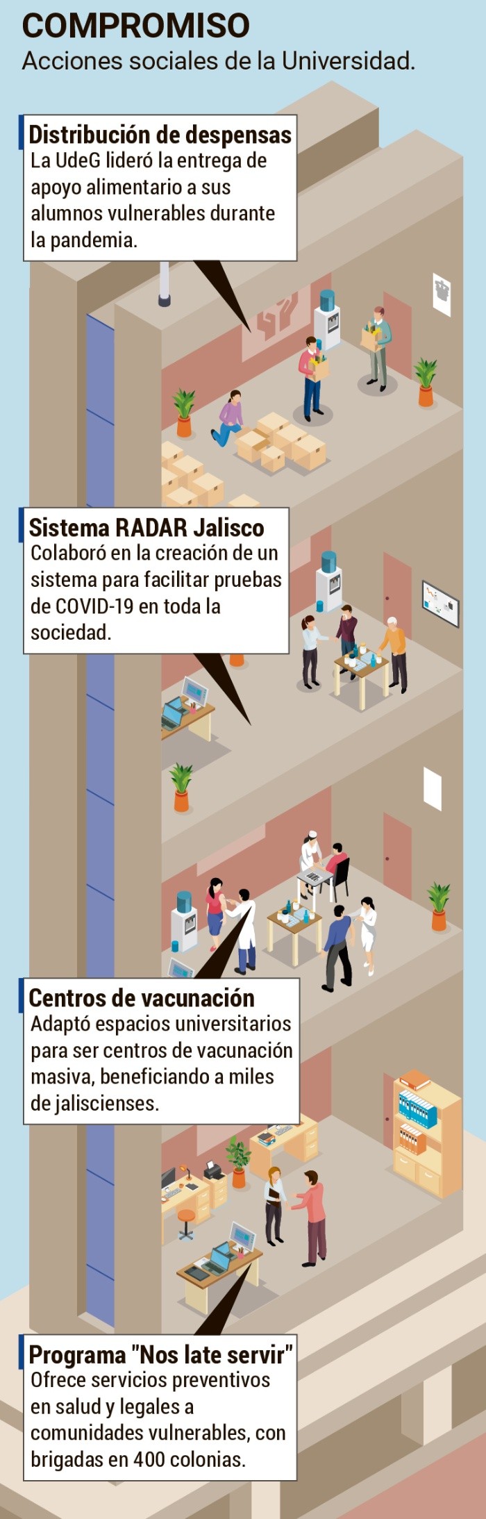 A lo largo de los últimos 30 años, en los cuales se ha consolidado la Red Universitaria, la Universidad de Guadalajara (UdeG) se ha caracterizado por ser una universidad social, no sólo por inculcar a su comunidad el sentido de responsabilidad hacia la sociedad, sino por impactar directamente en ella al ponerse a su servicio.Sólo un ejemplo de ello fue lo vivido durante la contingencia ocasionada por el COVID-19, cuando la UdeG fue pieza clave para enfrentar la crisis, poniendo al servicio de los jaliscienses todos sus recursos.Uno de los primeros esfuerzos fue que, con apoyo del Gobierno del Estado y de la estrategia Jalisco sin Hambre, la universidad lideró la distribución de despensas a sus alumnos más vulnerables, aportando sustento a miles de familias en el aislamiento.La Universidad de Guadalajara también apoyó en la creación del Sistema RADAR Jalisco, gracias a lo cual se facilitó la aplicación de pruebas de detección de COVID-19 a la sociedad en general, permitiendo que más personas accedieran a diagnósticos oportunos. Centros universitarios en todo el estado se convirtieron en puntos estratégicos para la aplicación de pruebas, en un esfuerzo por descentralizar el acceso a ellas y acercarlo a las regiones que más lo requerían.Cuando llegó el momento de vacunar, bajo la estrategia, la Universidad volvió a movilizarse. Diferentes espacios universitarios se adaptaron como centros de vacunación masiva, en donde la logística y la organización de la UdeG resultaron esenciales para asegurar un proceso eficiente y ordenado, incluyendo la participación de cientos de prestadores de servicio que se sumaron en los distintos puntos de vacunación, en coordinación con las autoridades de salud del Estado, beneficiando así a la población jalisciense en su conjunto.Pero los esfuerzos no terminaron ahí, pues los apoyos en campo lograron conformarse, hacia 2022, en el programa Nos late servir, mediante el cual se llevan distintos servicios a las comunidades que más lo necesitan, de la mano de sus prestadores de servicio social, representando el compromiso activo de la Universidad de Guadalajara con el bienestar y la salud de las comunidades de Jalisco, y canalizando el esfuerzo solidario de estudiantes, académicos y voluntarios hacia quienes más lo necesitan.A través de jornadas que van a las colonias y comunidades que más lo necesitan, los universitarios que comprenden la estrategia Nos late servir, coordinada por la Unidad de Servicio Social de la UdeG, organizan campañas preventivas en salud mental, dental, en materia de adicciones y enfermedades crónicas, además de servicios jurídicos gratuitos, a través de brigadas comunitarias en alrededor de 400 colonias de la Zona Metropolitana de Guadalajara, así como en las distintas regiones de la entidad.Incluso, los integrantes de este programa han apoyado en el manejo de recaudación y envío de apoyos ante desastres naturales, como ocurrió en noviembre pasado durante la contingencia que vivió Guerrero por el paso del huracán Otis, donde alrededor de 350 voluntarios participaron por largas jornadas para la elaboración de despensas que se enviaron para hacer frente a los daños.FRASE“La UdeG fue la primera institución que se acercó a ofrecer lo que tenía. En este momento difícil ha mostrado una verdadera actitud de compromiso con una política de Estado. Las universidades públicas nos debemos a la sociedad, pero también somos parte del Estado. Por ello, la UdeG ha puesto a disposición de los jaliscienses todos sus esfuerzos para hacer frente a esta contingencia”.Ricardo Villanueva, rector general de la UdeG