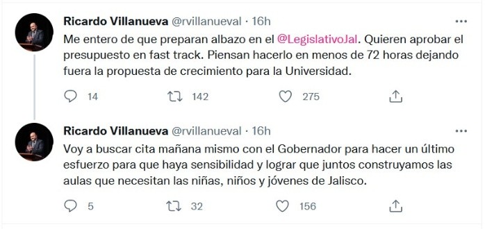 Con el fin de evitar que se deje fuera la propuesta de crecimiento de presupuesto para la Universidad de Guadalajara (UdeG), la Red Universitaria se manifestará frente al Congreso de Jalisco este 1 de diciembre a las 11:00 de la mañana.“Estamos convocando a todos los universitarios que nos quieran acompañar y a todos los padres de familia que tengan hijos menores de 15 años a que nos acompañen a pedirle al Congreso un presupuesto justo, un presupuesto que permita hacer frente a la necesidad de aulas que vamos a tener en 10 años. Viene la curva poblacional más grande, en 10 años vamos a tener la mayor cantidad de aspirantes en la historia de la universidad y para eso hay que prepararnos”, señaló el rector general, Ricardo Villanueva Lomelí.Destacó que ayer se enteró que se está tratando de hacer un “fast track” en el Congreso para aprobar el presupuesto sin haber acabado la glosa y sin haber tenido respuesta al planteamiento de crecimiento al presupuesto de la Universidad.“No pedimos nada inviable, simplemente un trato justo, como lo que Jalisco está pidiendo a la Federación tenemos que pedir entre jaliscienses, por congruencia. Estamos convocando a que mañana vayamos a decirle a los diputados que ojalá que regrese la legalidad, la cordura, la sensatez y que contemos con el apoyo del Congreso para poder construir las aulas”, dijo.El rector detalló que los integrantes de la Red podrán llegar por sus propios medios a la concentración en la Plaza Liberación y él, junto con los trabajadores del edificio de Rectoría, saldrán del mismo pero sin obstruir el tráfico, como lo han hecho en las caminatas hacia Casa Jalisco.Señaló que, aunque en días previos hubo diálogo con los diputados en los que hubo una propuesta, no se cumplió.“Yo me había ido con una propuesta que pensé que podíamos resolver, en la noche festejamos que hubiera una solución, pero esa misma noche la fracción de Movimiento Ciudadano negó que haya sido el planteamiento”, resaltó.Este lunes, el rector informó que hoy pediría cita con el gobernador “para hacer un último esfuerzo para que haya sensibilidad y lograr que juntos construyamos las aulas que necesitan las niñas, niños y jóvenes de Jalisco”, sin embargo, aseguró que no le ha dado respuesta.“Espero y creo que sí se pueda dar. Durante todo el tiempo que tuve comunicación con el gobernador logramos cosas buenas para Jalisco. La falta de comunicación puede que sea un factor que no nos está ayudando. Por eso lo quiero buscar y reencontrarme con ese gobernador con el que dos años hicimos cosas maravillosas para Jalisco”, destacó.Desde el pasado 15 de octubre, la UdeG inició las “Caminata por la Autonomía, la Salud y la Educación” hacia Casa Jalisco con el fin de que se le devolvieran 140 millones de pesos del presupuesto que era para el Museo de Ciencias Ambientales.JM