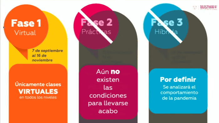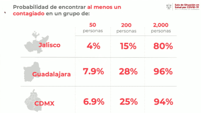 La Universidad de Guadalajara (UdeG) descartó hoy volver a clases presenciales para el 14 de octubre, como había previsto, y continuará con la fase 100% virtual en todos los niveles por lo menos hasta mediados noviembre debido a la contingencia por el coronavirus."No podremos entrar a la fase 2 de clases prácticas y continuaremos en la fase 1 hasta el 16 de noviembre", dijo este martes el rector de la UdeG, Ricardo Villanueva, durante la presentación un análisis del actual escenario epidemiológico en el estado.Aunque se puso el nuevo plazo, Villanueva admitió que es poco probable que se regrese a las aulas en lo que resta del año 2020."Honestamente creemos que las clases teóricas será difícil que regresemos este año", dijo el rector.Reconoció que las prácticas, como laboratorios, resultan en un problema académico por lo que, cuando haya condiciones de volver a las aulas, será solo para esas clases prácticas.Las autoridades de la UdeG consideraron que la situación actual de la pandemia en Jalisco no permite el regreso a las aulas.La probabilidad de encontrar al menos un contagiado de coronavirus en un grupo de 50 personas en Guadalajara es de 7.9%; en uno de 200 personas, de 28%, mientras que en uno de 2 mil personas aumenta a 96%, según los datos presentados por la Sala de Situación de Salud por COVID-19 de la universidad.Esto significa más riesgo comparado con la Ciudad de México, donde la probabilidad de hallar un contagiado es de 6.9% en el caso de un grupo de 50 personas; de 25%, con 200 personas, y de 94% con 2 mil personas.IM
