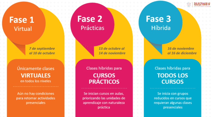Con el fin de “rescatar el semestre”, el Rector General de la Universidad de Guadalajara (UdeG), Ricardo Villanueva señaló que regresarán a clases “híbridas” para cursos prácticos a partir del 13 de octubre. Esto como parte de las tres fases del regreso a clases.La primera fase, que comprende del 7 de septiembre al 10 de octubre, será virtual para todos los niveles, pues no hay condiciones para un regreso presencial.La segunda, del 13 de octubre al 14 de noviembre, serán clases híbridas (presenciales y virtuales) solo para aquellos cursos que tienen naturaleza práctica y no se puede virtualizar.Esto se hará con todos los protocolos sanitarios, que incluyen grupos de no más de 15 alumnos, sana distancia y ventilación.Para la tercera fase, del 16 de noviembre al 16 de diciembre, se plantea el regreso de clases híbridas para todos los cursos pero con grupos reducidos (10-15 alumnos) menos horas y de manera voluntaria para quienes pertenezcan a grupos vulnerables.Villanueva aclaró que las fechas, establecidas junto con la Sala de Situación y el consejo de rectores, serán flexibles y las fases se darán sólo si el comportamiento de la pandemia en el Estado lo permite, lo cual evaluará la Sala de Situación.Marco Antonio Muñoz Valle, rector del Centro Universitario de Ciencias de la Salud (CUCS), destacó que los protocolos para el regreso a clases híbridas serán estrictos. También se desarrollará un micrositio con la información necesaria que contendrá guía de cómo cuidarse, comunicados e información sanitaria y un buzón de comentarios.NR