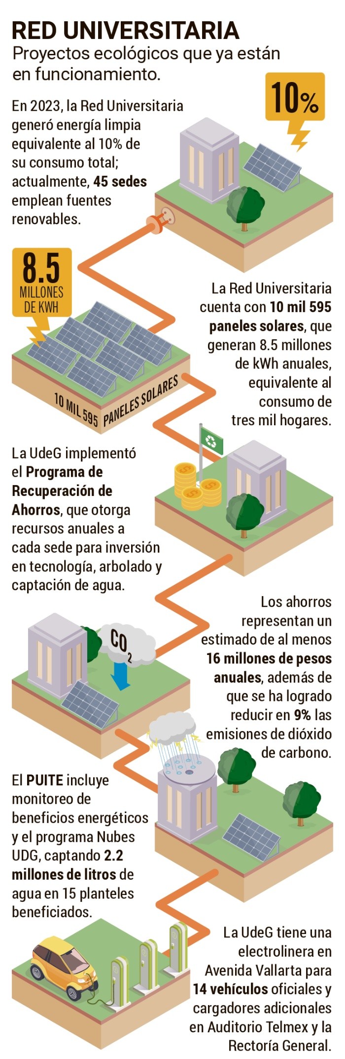 La Universidad de Guadalajara (UdeG) busca fomentar el compromiso social en su comunidad educativa, y la responsabilidad ambiental es uno de los componentes clave en este propósito.Por ello, la Universidad ha emprendido una agenda de responsabilidad ambiental a través del Programa Universitario Integral de Transición Energética (PUITE) desde finales de la década pasada, en cumplimiento de uno de los 17 Objetivos de Desarrollo Sostenible de las Naciones Unidas: garantizar el acceso a una energía asequible y no contaminante.La energía es el principal factor que contribuye al cambio climático, representando cerca de 60% de todas las emisiones mundiales de gases de efecto invernadero. Ante esto, la UdeG, mediante el PUITE, ha impulsado diversas estrategias para optimizar su manejo energético.Con este programa, la casa de estudios se convirtió en la primera institución educativa en América Latina en implementar un plan integral de energías renovables.“Uno de los temas más importantes es la concientización y propuesta de proyectos que aporten al cuidado del medio ambiente; esto es sumamente importante porque estamos acabando con el planeta”, señaló Ricardo Villanueva Lomelí, Rector General de la UdeG, el pasado martes, durante la presentación de los logros obtenidos en el periodo 2020-2024 con el programa UDG Verde, en el auditorio principal del CUCEA.Villanueva Lomelí subrayó que a las universidades les corresponde reducir la huella ecológica generada por sus estudiantes y trabajadores, lo cual puede contribuir a revertir la contaminación que los seres humanos generamos. También destacó la importancia de crear espacios que inviten a la reflexión y a compartir conocimientos ambientales, como sucede en el Museo de Ciencias Ambientales.A partir de un estudio previo a la implementación del PUITE, se identificó que el 70% del consumo energético de los centros universitarios se debía al uso de luminarias, por lo que se adoptaron acciones de eficiencia energética que incluyeron la sustitución de luminarias por lámparas con tecnología LED en los distintos centros universitarios de la Red.El programa involucra a toda la comunidad universitaria, ya que no solo comprende la modernización de la infraestructura, sino también el compromiso de cada alumno, académico, directivo y empleado administrativo.Gracias a estas acciones, la Universidad de Guadalajara ha logrado ocupar destacados lugares en el Times Higher Education (THE) Impact Rankings 2024, que evalúa el compromiso de dos mil 152 instituciones de educación superior en el mundo.En dicho ranking, la UdeG obtuvo 84.7 puntos, resultado de la evaluación de sus iniciativas, lo que le permitió ubicarse en el puesto 11 a nivel internacional, consolidándose como una institución líder en generación de energías limpias.Para Villanueva Lomelí, estos logros se deben a la apertura de toda la Red Universitaria, que ha convertido un compromiso en una realidad que impacta a toda la comunidad educativa.Agregó que, además, esto beneficia a los más de 335 mil miembros de la Red Universitaria, quienes pueden empezar a cambiar su paradigma y adoptar, en sus acciones cotidianas, una visión de sostenibilidad ambiental.De esta manera, se espera que los jóvenes generen una “conciencia energética” tanto en su comunidad estudiantil como en sus entornos fuera de las aulas. “El verdadero cambio será el impacto en la conciencia de los estudiantes, quienes verán directamente el uso de energía solar y entenderán su importancia en la transición energética”, concluyó Villanueva Lomelí.FRASE“Este es un símbolo que nos compromete a poner todo nuestro empeño, pues es uno de los retos más importantes de la humanidad. Esta fue una de las propuestas que hice: que no fuera solo un lema, sino que nos comprometiéramos a transitar hacia las energías limpias”.Ricardo Villanueva Lomelí, rector general de la UdeG.