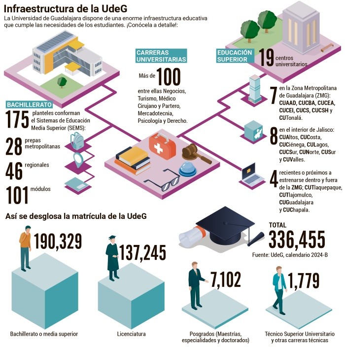 La Universidad de Guadalajara cuenta con un total de 336 mil 455 estudiantes en todos sus niveles educativos: preparatorias, carreras técnicas, licenciaturas y posgrados o especialidades. Esto la coloca entre las universidades con mayor matrícula a nivel nacional. Además, la máxima institución educativa universitaria de Jalisco ha aumentado cada vez más su número de alumnos, en gran medida, por la construcción de más preparatorias y de los Centros Universitarios como el de Tlaquepaque, el de Tlajomulco de Zúñiga, el de Guadalajara o el de Chapala, este último próximo a inaugurarse. El número de espacios en la UdeG se incrementará en los próximos años y se contempla alcanzar, e menos de una década, a la institución universitaria líder en matrícula, la Universidad Nacional Autónoma de México (UNAM), la principal casa de estudios de todo el país. “El crecimiento que van a tener estos cuatro centros universitarios está proyectado para 40 mil a 50 mil alumnos en los siguientes 10 años. Solo con estos cuatro centros, vamos a alcanzar a la UNAM; en cinco o siete años, la UdeG tendrá la misma matrícula. Ya están los centros; solo es cuestión de esperar a que crezcan”, declaró. En el último ciclo escolar de la UNAM, el 2023-2024, la institución capitalina contaba con alrededor de 373 mil estudiantes en todas sus modalidades, cifra que se espera igualar con los nuevos centros universitarios ya mencionados.Una de las metas de Ricardo Villanueva cuando inició su periodo como rector de la Universidad de Guadalajara (2019-2025) fue lograr que los centros universitarios sean multitemáticos.Un centro multitemático reúne diferentes carreras pese a no ser de la misma temática, como sucede por ejemplo con el Centro Universitario de Ciencias de la Salud (CUCS), en donde se concentran las licenciaturas que tengan que ver con ese tópico como Psicología o Médico Cirujano y Partero. Los recientes centros regionales inaugurados (CUTlajomulco, CUTonalá), así como los otros ya activos (CUValles, CUAltos) son ejemplos de universidades multitemáticas. Villanueva apuesta por su implementación progresiva en todo el estado: “Los campus regionales son multitemáticos y funcionan mejor. Me tocó ser rector de un campus así (en Tonalá). Cuando se junta un estudiante de medicina con uno de derecho o con uno de artesanías, suceden cosas maravillosas”.Además de apostar por estos campus, el rector se comprometió a que en su periodo se sienten las bases hacia un modelo híbrido de enseñanza, que combine clases virtuales y presenciales: “La UdeG tiene un papel más allá de la docencia o lo académico. Creo que las escuelas tienen un rol de socialización que no se cubre”, dijo. Entre los centros universitarios de la ciudad inaugurados recientemente está el de Guadalajara o CUGDL: este inició clases oficialmente el pasado 12 de agosto. El plantel, que se ubica en la calle Guanajuato número 1045, colonia Alcalde Barranquitas, ocupa las antiguas instalaciones del Centro Universitario de Ciencias Sociales y Humanidades (CUCSH).De acuerdo con información de la misma casa de estudios, la primera generación de la Red Universitaria cuenta con 600 alumnos que se reparten en las licenciaturas de Ciberseguridad, Creatividad Digital, Inteligencia Artificial y Ciencia de Datos, Inteligencia Financiera de Negocios y Tecnologías Biomédicas.