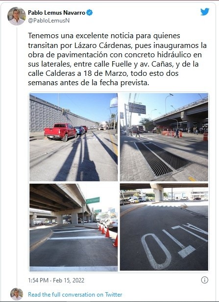 Con una inversión de 32 millones 750 mil 497 pesos, según datos de la Dirección de Obras Públicas de Guadalajara, el Gobierno municipal habilitó después de dos meses el tránsito vial y peatonal en los dos sentidos de los carriles laterales de la Avenida Lázaro Cárdenas.En esta zona, los trabajos incluyeron la pavimentación de los carriles laterales de la calzada Lázaro Cárdenas en dos laterales: una que abarca la calle Fuente con avenida Cañas y otra entre la calle Calderas con la avenida 18 de Marzo.El presidente municipal de Guadalajara, Pablo Lemus, dio a conocer que el proyecto comenzó el 15 de diciembre de 2021. Inicialmente habían proyectado concluir las obras en un lapso de 75 días, pero el proyecto pudo finalizar en 62 días.“Lo que vemos hoy en esta entrega que hacemos de las laterales de Lázaro Cárdenas, desde limita con Tlaquepaque, es concreto hidráulico que tiene una durabilidad de 30 años”, señaló el mandatario.Dentro de estas obras se realizó la pavimentación con concreto hidráulico MR-45, sustitución de red de drenaje, registros sanitarios, cambio de línea de agua potable, construcción de banquetas con accesibilidad universal, así como colocación de adoquín podotáctil, bolardos, postes y vegetación.El director de Obras Públicas de Guadalajara, Francisco Ontiveros Balcázar, dio a conocer que la intervención abarcó aproximadamente un kilometro de calle entre las dos laterales para el soporte de la cargar de uso diario en estas calles; además, colocaron 40 iluminarias nuevas para facilitar el trayecto peatonal en cruceros seguros.“Se intervino cerca de un kilómetro de calle con concreto. Las banquetas son 25 centímetros de espesor para que soporten la carga de uso diario de las calles. También se colocaron 40 nueva luminarias peatonales” destacó el titular.Autoridades informaron que durante los próximos días iniciarán también intervenciones en las vialidades Río Reforma y Refinería de dicha zona.JM