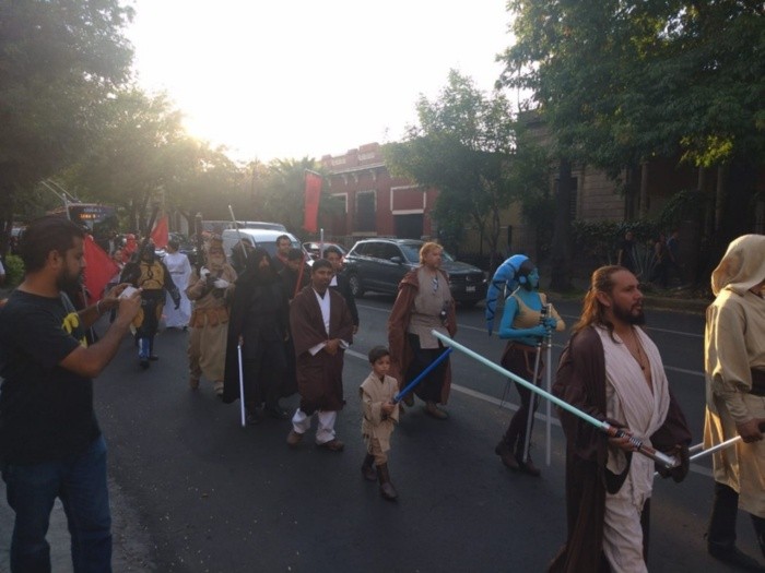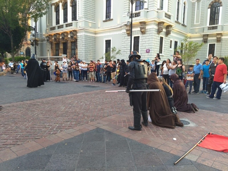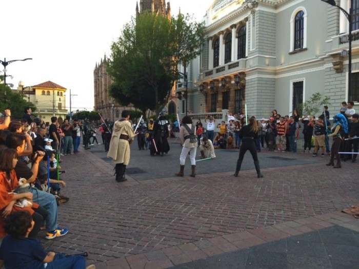 Un grupo de al menos unas 50 personas salieron a las calles vestidos como los personajes de la saga de Star Wars.Con sables de luz en mano, vestidos como Obi One Kenob, la Princesa Leia, Darth Vader, Luke Skywalker, Jedis y Aayla Secura, caminaron por las calles de la ciudad para arribar en grupo a la explanada de la Rambla Cataluña a un costado del Paraninfo de la Universidad de Guadalajara (UdeG) y representar algunas escenas de las películas.Los Jedis se enfrentaron contra el lado oscuro en la calle, para morir en la batalla. Durante el recorrido, paseantes se iban uniendo a la manifestación. NM