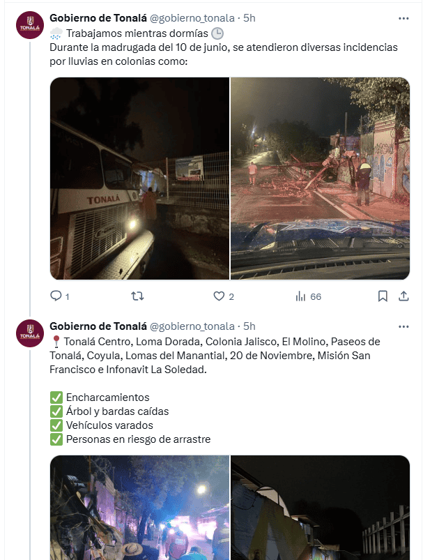 Durante la madrugada de este martes, una fuerte lluvia se hizo presente en el Área Metropolitana de Guadalajara (AMG), en las localidades de Zapopan, Tlaquepaque, Tonalá y Tlajomulco de Zúñiga.Esta representa la primera lluvia de gran intensidad del temporal y dejó a su paso diversas afectaciones.A través de sus redes sociales, Protección Civil y Bomberos de Zapopan reportaron que por la lluvia, autos quedaron varados en el paso a desnivel de Valle Real.Además, se registraron niveles de 50 cm en el paso a desnivel de Periférico y la Avenida 5 de mayo, al igual que en el paso a desnivel de la Avenida Ávila Camacho.En López Mateos, a la altura de la Unidad Administrativa, también se llevaron a cabo maniobras para retirar el agua. El Gobierno de Tonalá informó que se atendieron diversas incidencias en el municipio por la lluvia, en colonias como Tonalá Centro, Loma Dorada, Colonia Jalisco, El Molino, Paseos de Tonalá, Coyula, Lomas del Manantial, 20 de Noviembre, Misión San Francisco e Infonavit La Soledad.Hubo encharcamientos, árbol y bardas caídas, vehículos varados y personas en riesgo de arrastre. No se reportaron personas lesionadas. Hasta el momento, las autoridades de otros municipios del AMG no han presentado un corte definitivo de las afectaciones por la lluvia de ayer.* * * Mantente al día con las noticias, únete a nuestro canal de WhatsApp * * *MB