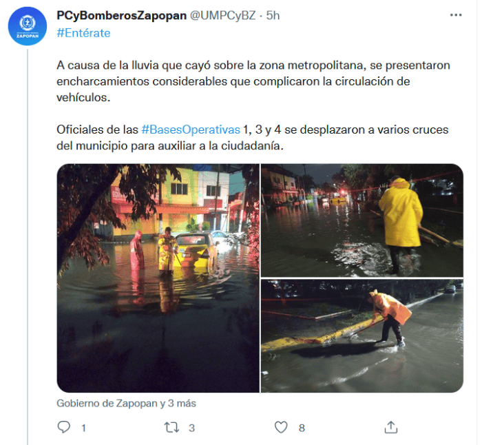 La lluvia que se registró en la Zona Metropolitana de Guadalajara (ZMG) desde la madrugada de este martes ya ha dejado inundaciones, tanto en vía pública, como en casas, además de vehículos varados.Protección Civil y Bomberos de Zapopan informó que en el municipio se reportaron 12 inundaciones en vía pública:Además, se registraron tres inundaciones en casa habitación en las siguientes colonias:Así como una inundación a comercio en la colonia Arroyo Hondo, en el cruce de Las Torres y privada Guadalupe Victoria, y nueve vehículos varados en los puntos de inundación.Algunos puntos de la ZMG se quedaron sin luz, lo que generó que semáforos de distintos cruceros no estén funcionando.GC