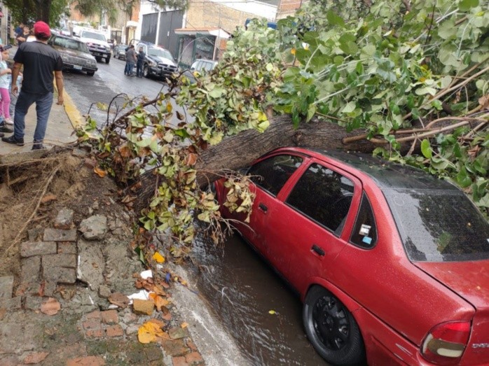 La lluvia de esta tarde tuvo como principales afectaciones una inundación en la colonia Jardines del Bosque en Guadalajara, con un auto varado y cuatro árboles caídos. No hubo lesionados.Según las redes sociales de Radar Doppler, del Instituto de Astronomía y Meteorología de la Universidad de Guadalajara, la tormenta comenzó alrededor de las 17:30 horas, siendo de moderada a fuerte con granizo en Zona Minerva e Industrial; se movió la lluvia hacia el sur de Zapopan.La Coordinación de Protección Civil y Bomberos de Guadalajara señaló que en el cruce de avenida Niños Héroes y avenida Arcos, un auto quedo varado por la inundación que alcanzó alrededor de 40 centímetros. Los pasajeros que iban en el vehículo alcanzaron a salir por sus medios, sin heridos.Cuatro árboles cayeron por la lluvia y la racha de vientos que alcanzaron velocidades entre los 31 a 89 kilómetros por hora. El primer árbol reportado fue en el cruce de Isla Sumatra y Barlovento; después cayó otro de 15 metros en Topacio y Lapislázuli afectando a varios autos que estaban estacionados, sin personas lastimadas; el tercero de 10 metros cayó en avenida de los Ahuehuetes y la calle Cidro, también varios vehículos dañados, sin lesionados; el último árbol que cayó fue en Niños Héroes e Inglaterra.En Zapopan solamente hubo encharcamientos en la colonia Miramar, en los alrededores de Plaza del Sol y Jardines de Guadalupe.JM