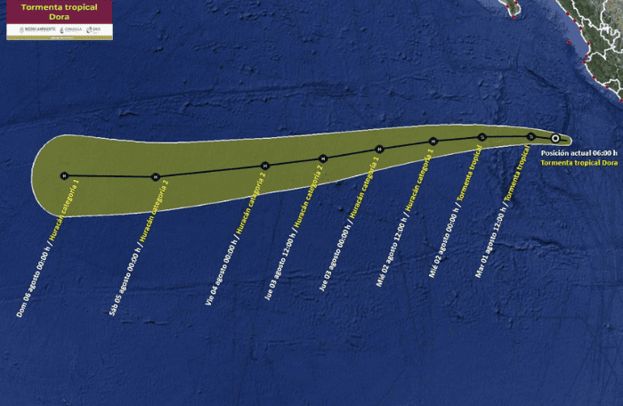 La temporada de huracanes en el Océano Pacífico comenzó el pasado 15 de mayo y finalizará hasta el próximo 30 noviembre. Se prevé que se desarrollen entre 16 y 22 ciclones tropicales únicamente en ese litoral. Por ahora, la tormenta tropical "Dora" se encuentra localizada al suroeste de las costas de Colima y Jalisco; y tras ella se vigilan los fenómenos que podrían dar origen al siguiente ciclón de la temporada, "Eugene".Las bandas nubosas de "Dora" ocasionan lluvias muy fuertes en el occidente de México y se podría convertir en huracán mañana, 2 de agosto, pero al mismo tiempo ya existe otra zona que mantiene la vigilancia del Servicio Meteorológico Nacional (SMN), fuente oficial del Gobierno de México en materia climática.El SMN informó que mantiene la vigilancia en un área en la que se prevé la formación de una zona de baja presión frente a las costas de Jalisco, Colima y Michoacán. Este martes incrementó a 40% su probabilidad para desarrollo ciclónico en 7 días."Eugene" sería el quinto ciclón tropical de la temporada 2023, le seguirían "Fernanda", "Greg", "Hilary", "Irwin", "Jova", "Kenneth", "Lidia", "Max", "Norma", "Otis", "Pilar", "Ramón", "Selma", "Todd", "Verónica", "Wiley", "Xina", "York", "Zelda".De acuerdo al pronóstico del SMN, "Dora" podría alcanzar la categoría 1 como huracán mañana miércoles 02 de agosto, alrededor de las 12:00 horas, cuando se localice a 930 km al sur-suroeste de Cabo San Lucas, BCS. Y llegaría al nivel 2, el jueves 03 de agosto, cuando se ubique a mil 415 km al suroeste de Cabo San Lázaro, BCS, es decir, mientras se aleja del territorio nacional.Con información del Servicio Meteorológico NacionalOA