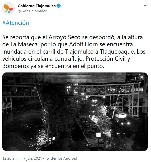 La lluvia que se registró la noche del domingo en la Zona Metropolitana de Guadalajara (ZMG) dejó inundaciones, árboles caídos y vehículos varados, así como el desbordamiento del Arroyo Seco, en Tlajomulco.El Gobierno de Jalisco reportó que se cayó un árbol en la calle Carlos A. Carrillo, al cruce con Anselmo Camacho, en la colonia Lomas de Polanco de Guadalajara.Autoridades viales cerraron la la circulación de ambos sentidos de López Mateos, de Mariano Otero a Popocatépetl, debido a una inundación en la zona, que además dejó vehículos atrapados.Además se reportan inundaciones en:El Ayuntamiento de Tlajomulco de Zúñiga informó que el Arroyo Seco se desbordó, a la altura de La Maseca, provocando inundación en Adolf Horn, en el carril de Tlajomulco a Tlaquepaque.