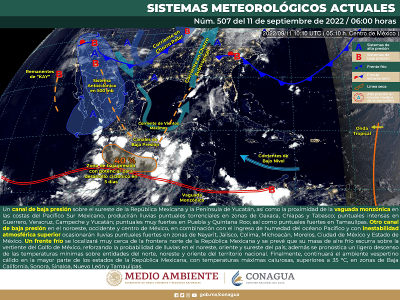 El Servicio Meteorológico Nacional (SMN) de la Conagua informó que para este domingo se prevén lluvias fuertes para algunas zonas del estado de Jalisco, esto debido a un canal de baja presión en el noroeste, occidente y centro de México. Además de Jalisco, las entidades de Nayarit, Michoacán, Morelos, Ciudad de México y Estado de México también registrarán fuertes tormentas. Sin embargo, el ambiente vespertino cálido permanecerá en la mayor parte de los estados de la República, con temperaturas máximas calurosas, superiores a 35 grados en zonas de Baja California, Sonora, Sinaloa, Nuevo León y Tamaulipas. Además, la Conagua detalló que un frente frío se localizará muy cerca de la frontera norte del país, “y se prevé que su masa de aire frío escurra sobre la vertiente del Golfo de México, reforzando la probabilidad de lluvias en el noreste, oriente y sureste del país; además se pronostica un ligero descenso de las temperaturas mínimas sobre entidades del norte, noreste y oriente del territorio nacional”. GC
